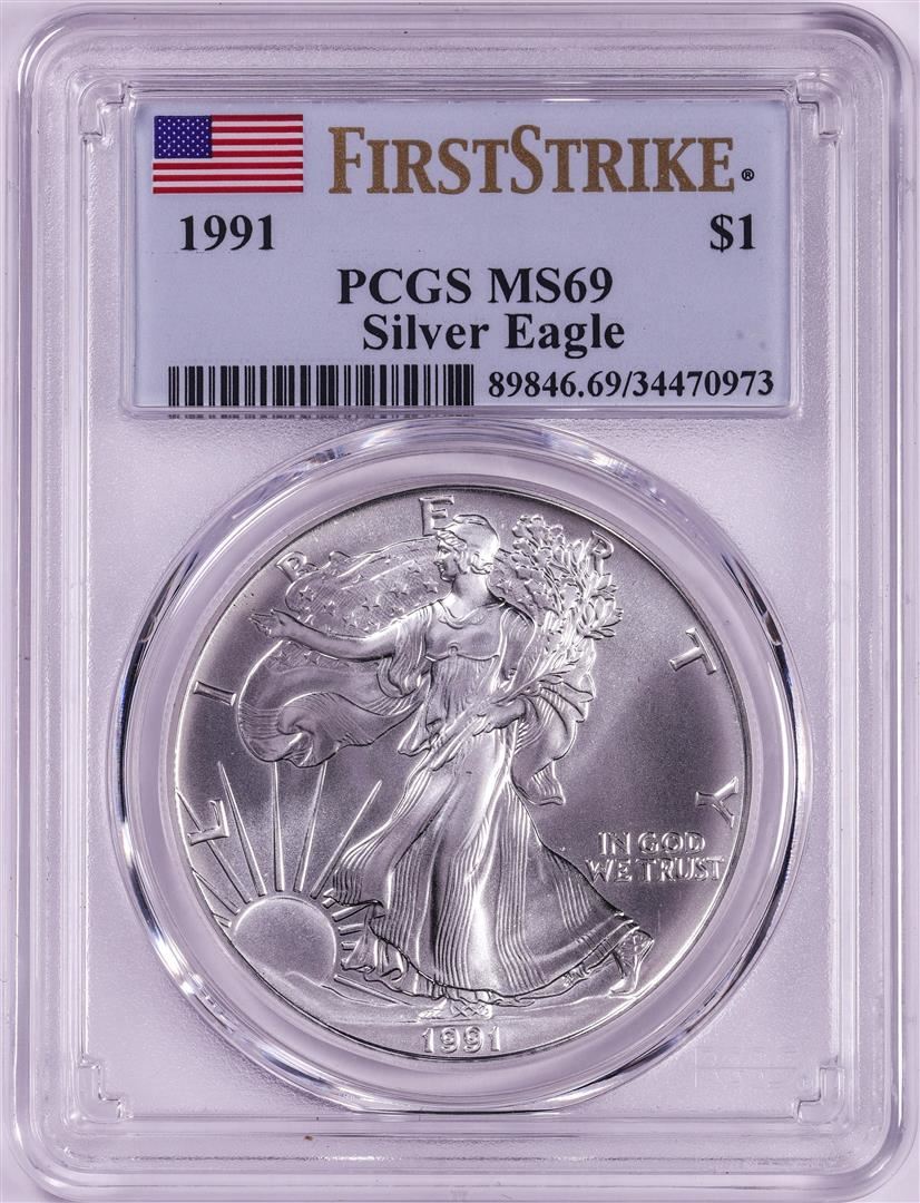One 1991 $1 American Silver Eagle Coin PCGS MS69 First Strike. PCGS Graded.