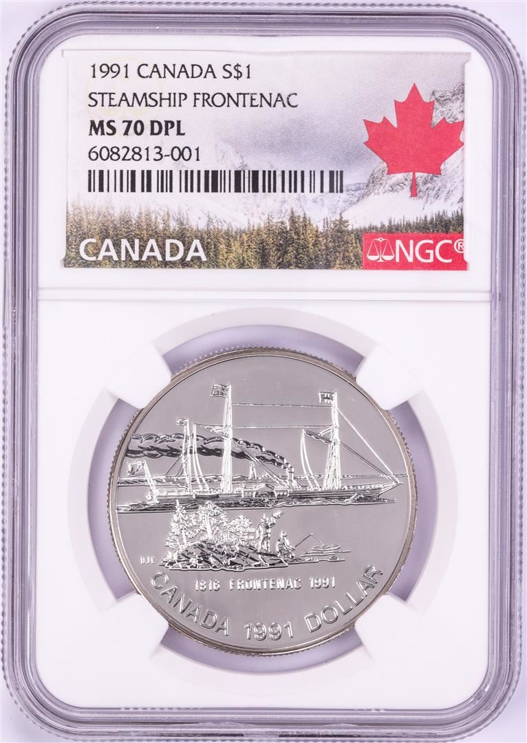 One 1991 $1 Canada Steamship Frontenac Silver Dollar Coin NGC MS70 DPL. NGC Certified.