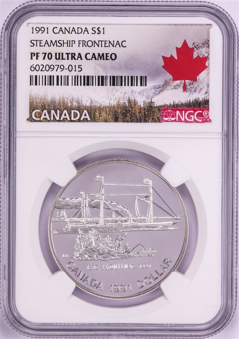 One 1991 $1 Proof Canada Steamship Frontenac Silver Dollar Coin NGC PF70 Ultra Cameo. NGC Certified.