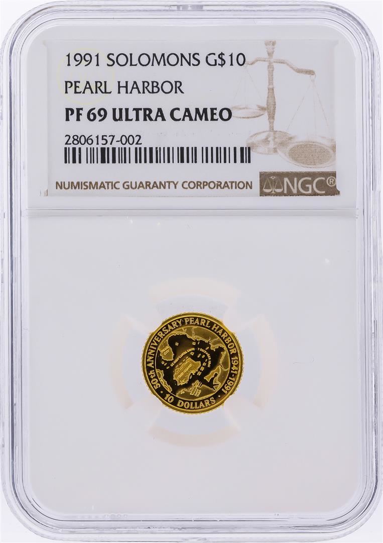 One 1991 $10 Solomons Pearl Harbor Gold Coin NGC PF69 Ultra Cameo. NGC Certified.