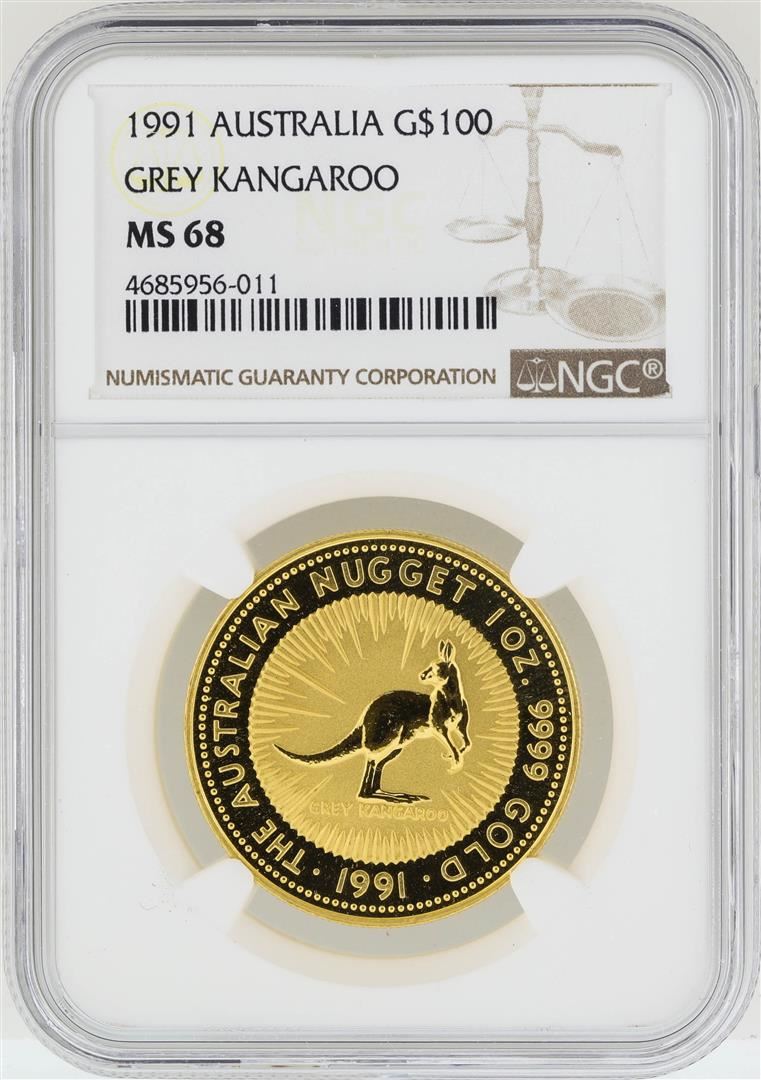 One 1991 $100 Australia Grey Kangaroo Gold Coin NGC MS68. NGC certified. NGC Certified.