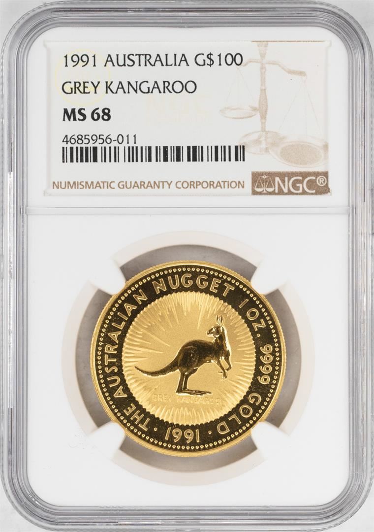 One 1991 $100 Australia Grey Kangaroo Gold Coin NGC MS68. NGC Certified.