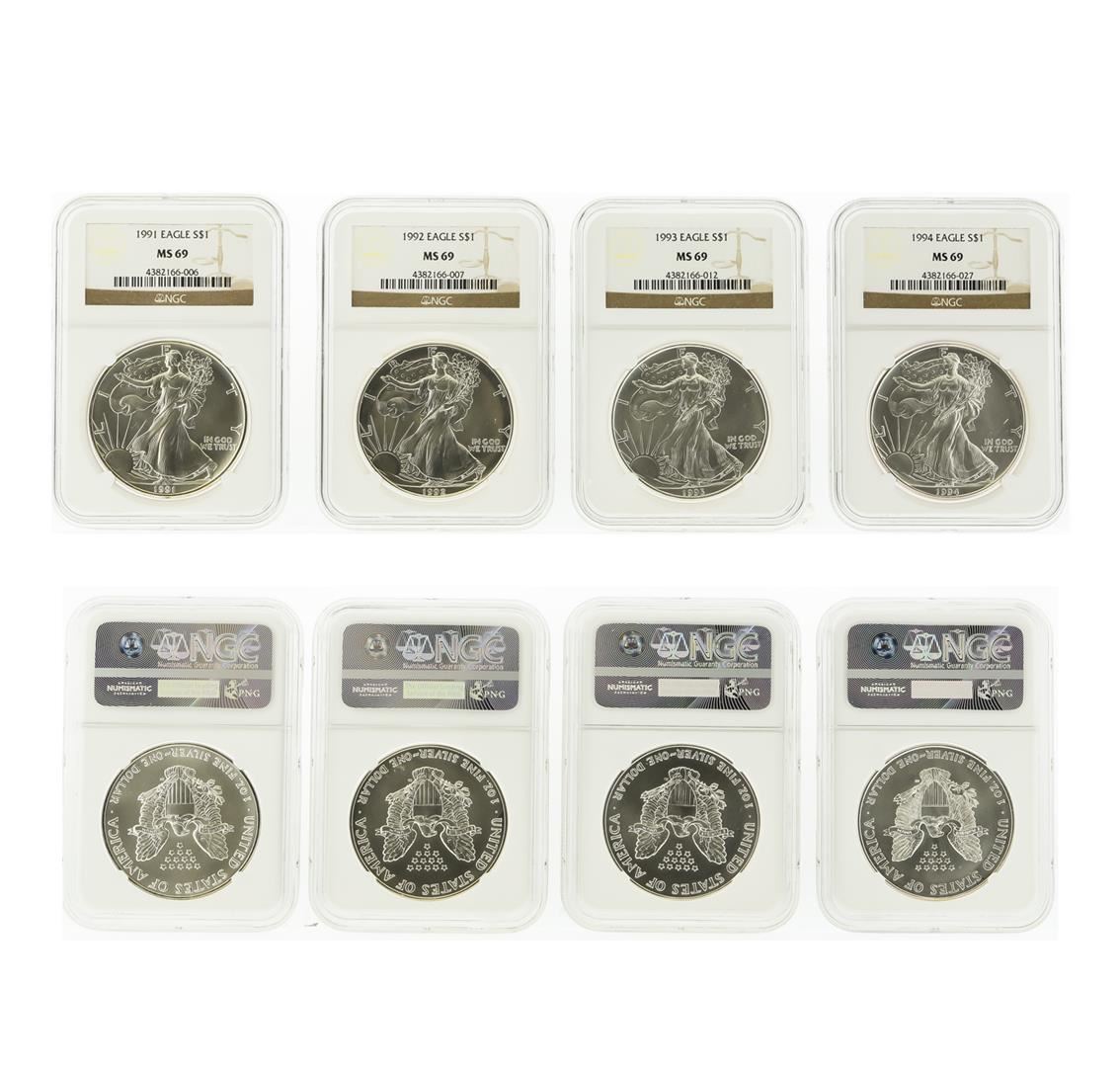 NGC MS69 American Silver Eagle Coin Set of 4 featuring: 1991 NGC MS69 American Silver Eagle, 1992 NGC MS69 American Silver Eagle, 1993 NGC MS69 American Silver Eagle, 1994 NGC MS69 American Silver Eagle. NGC Certified.