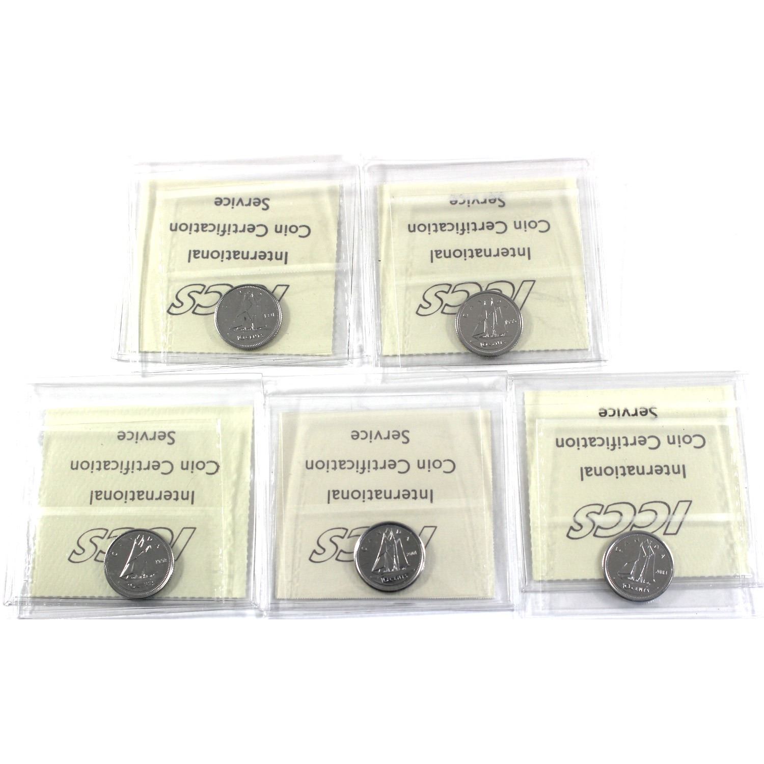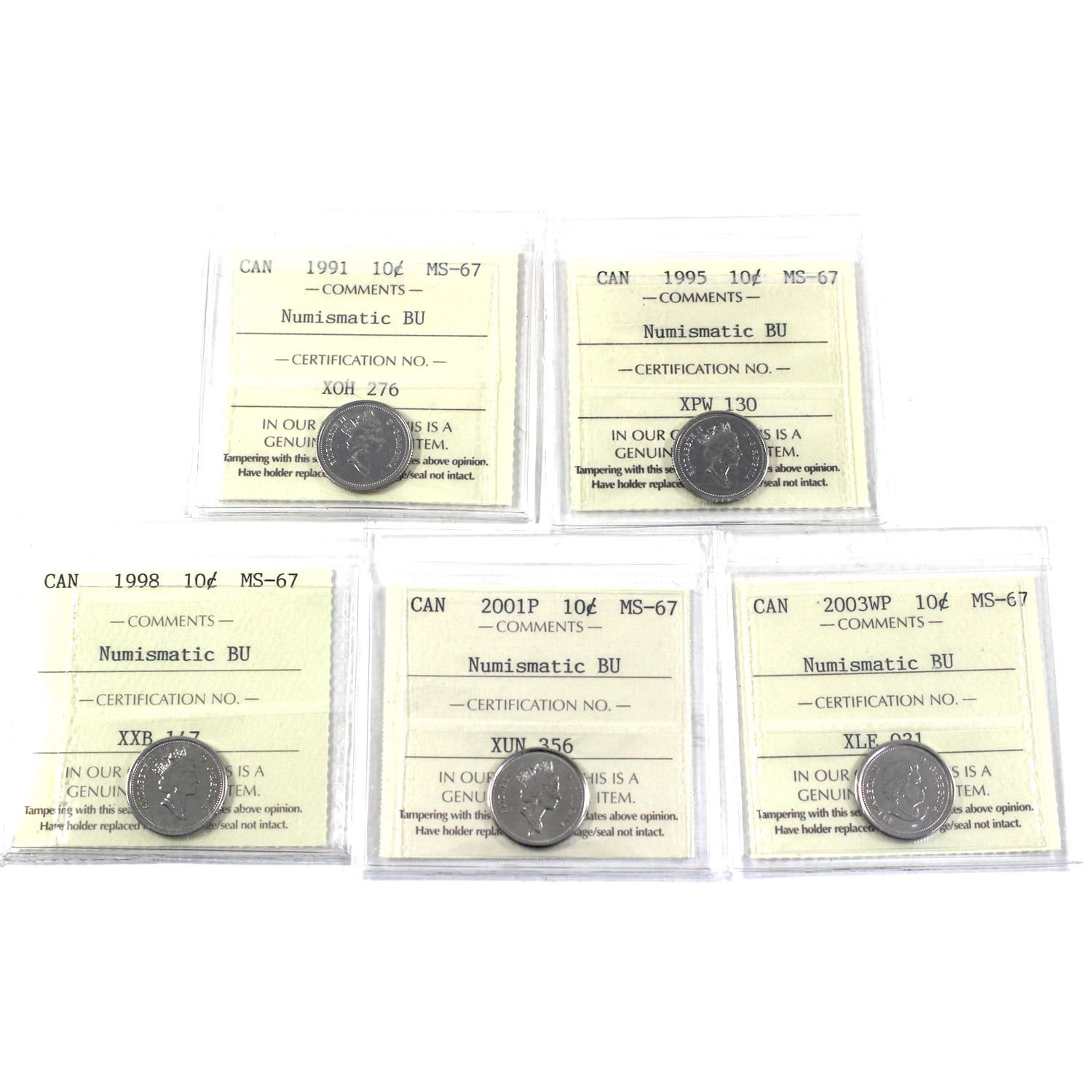 1991,1995,1998,2001P & 2003WP 10-cent ICCS Certified MS-67. 5pcs