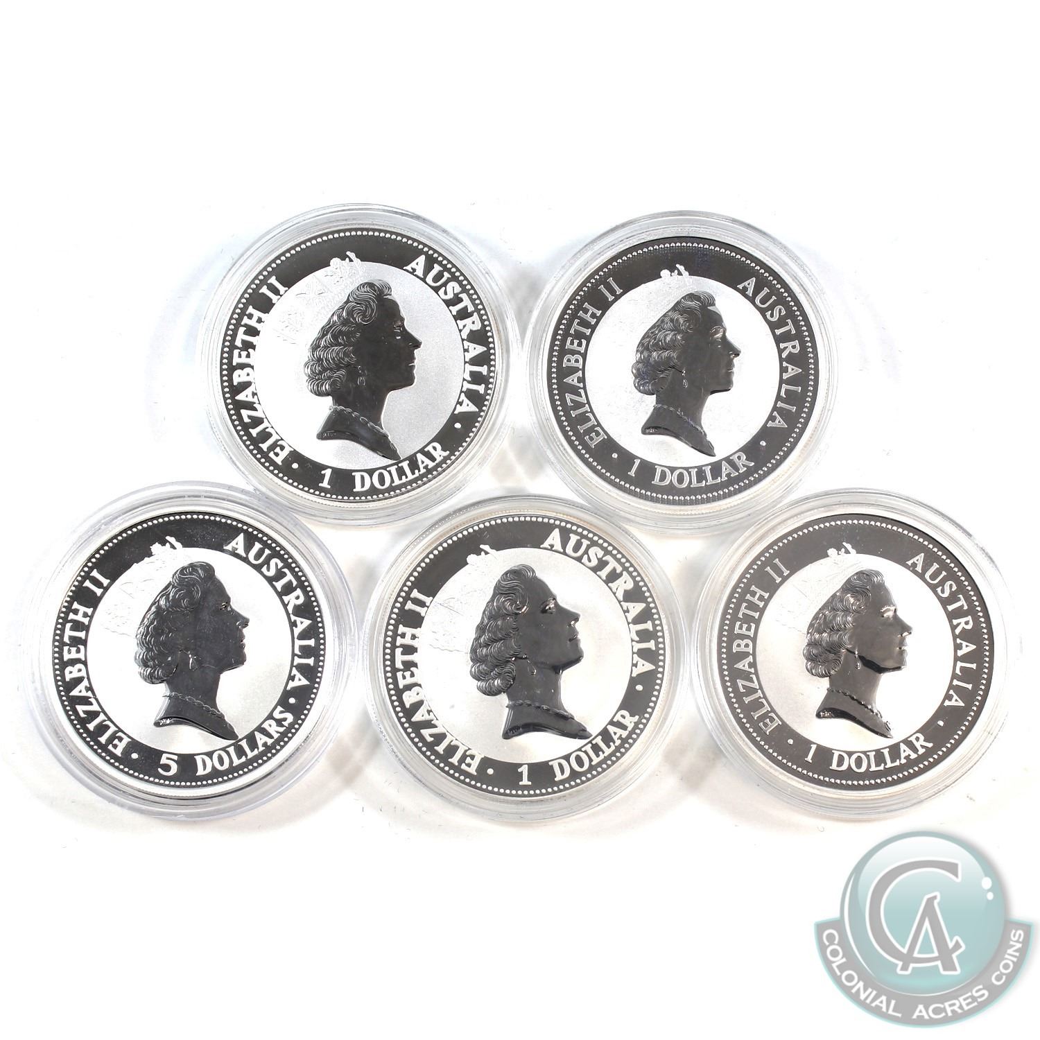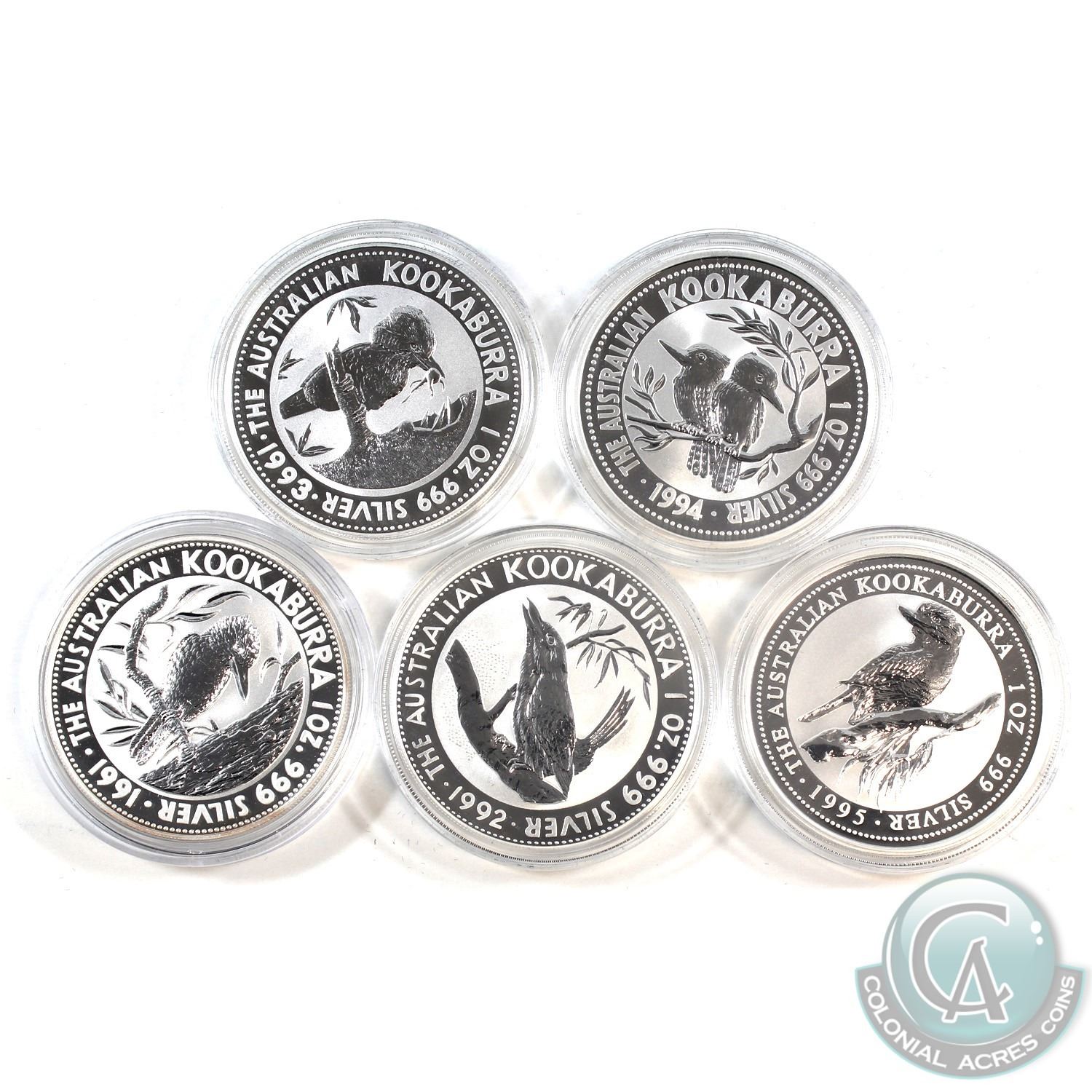 1991-1995 Australia 1oz Silver Kookaburra’s in original Mint Capsules, BU Condition. (Tax Exempt) You are bidding on a lot of 5x 1oz Perth Mint Silver Kookaburra’s, lot includes a 1991,92,93,94 & 95. All struck in a beautiful reverse proof finish and in original mint capsules. These older issue Kookaburra’s are becoming harder to find and becoming more and more desirable to collectors. Worth a premium Bid. 5pcs.