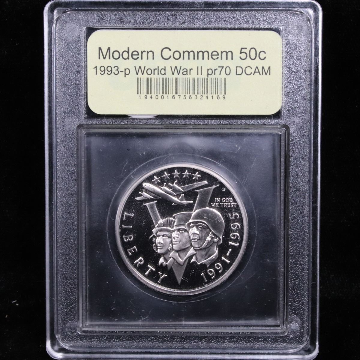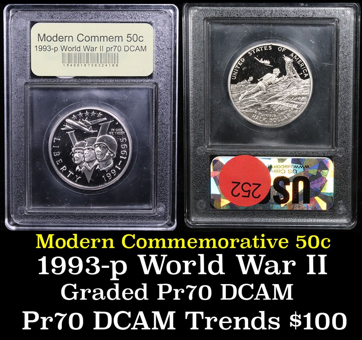 1991-1995-P WWII . . Modern Commem Half Dollar 50c Grades GEM++ Proof Deep Cameo. The Commemorative was released in 1993 and bears the dates 1991 and 1995 which signifies the 50th anniversary of WWII. Proof Half Dollar World War II Commemorative, Encapsulated and Graded PF70 DCAM by USCG. Estimated Value $250