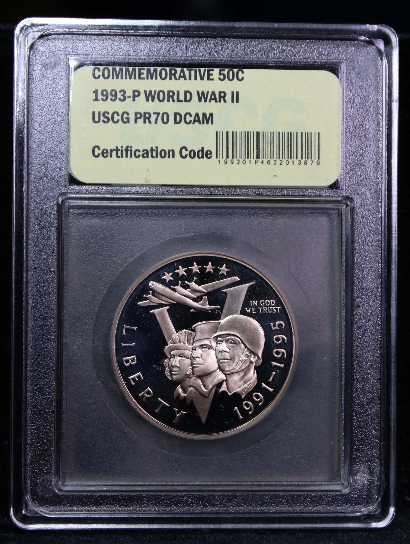 1991-1995-P WWII . . Proof Commem Half Dollar 50c Graded GEM++ Proof Deep Cameo By USCG. The Commemorative was released in 1993 and bears the dates 1991 and 1995 which signifies the 50th anniversary of WWII. Proof Half Dollar World War II Commemorative, Encapsulated and Graded Perfection Gem+++ Proof DCAM by USCG.