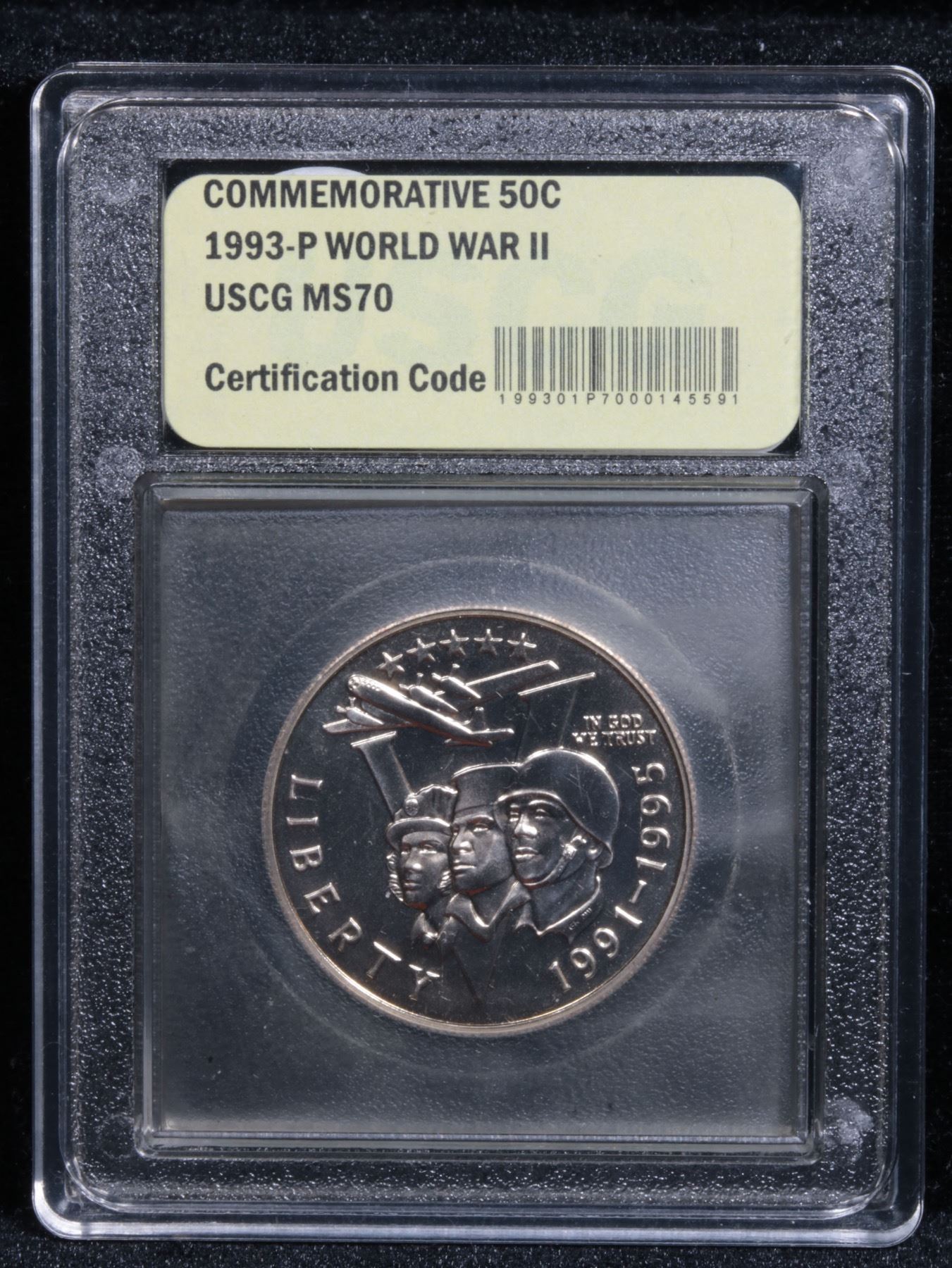 1991-1995-P WWII . . Proof Commem Half Dollar 50c Graded GEM++ Proof Deep Cameo By USCG. The Commemorative was released in 1993 and bears the dates 1991 and 1995 which signifies the 50th anniversary of WWII. Proof Half Dollar World War II Commemorative, Encapsulated and Graded Perfection Gem+++ Proof DCAM by USCG.