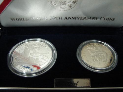 1991-1995 U.S. MINT WORLD WAR II 50TH ANNIVERSARY COMMEMORATIVE TWO-COIN PROOF SET. Consists of two coins. Coins are in case with box.
