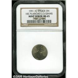 <B>1991 1C Lincoln Cent--Struck on a 10C Planchet--MS65 NGC.</B></I> 2.3 grams. A lustrous piece with faint tan patina. Well struck except for portions of STATES OF. A short pinscratch on the right side steps limits the grade.