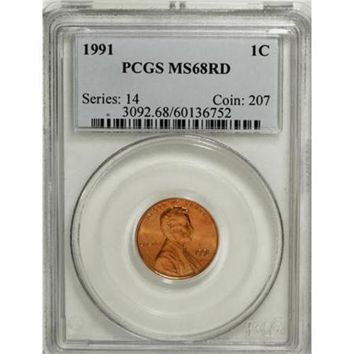 <B>1991 1C MS68 Red PCGS.</B></I> A boldly impressed and entirely fresh copper-orange representative of this modern issue, pristine and noteworthy for the Lincoln Memorial enthusiast. Population: 28 in 68 Red, 0 finer (8/07).<BR><BR><B>Coin Engraver:</B> Victor D. Brenner<BR><BR><b>Shipping:</b> Coins & Currency (<a target="_blank" href="http://www.heritageauctions.com/common/shipping.php">view shipping information</a>)