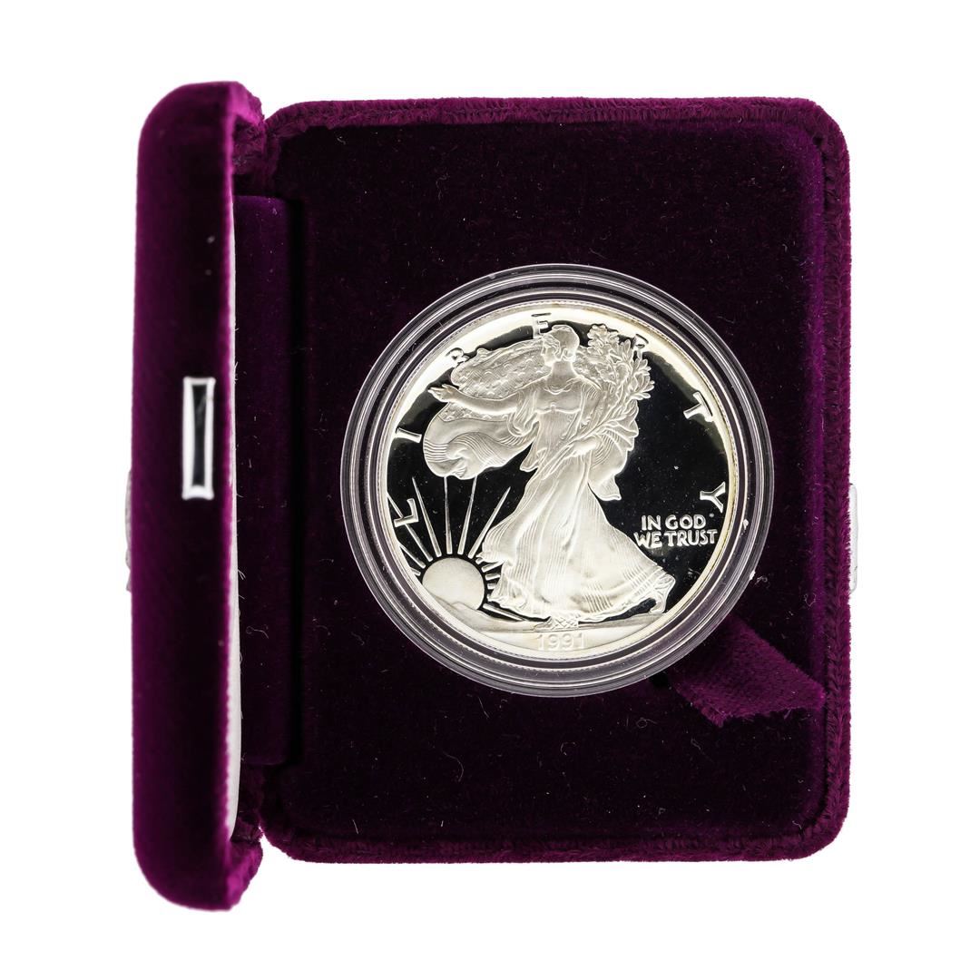 One 1991 1oz American Silver Eagle Proof Coin with Box.