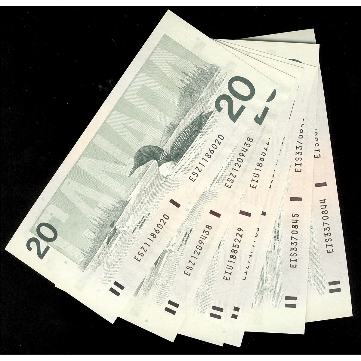 1991 $20 BC-58a #EIS(2), EIU, EIZ & BC-58b #ESZ(2) notes. Lot of 6 notes EF+ to UNC.