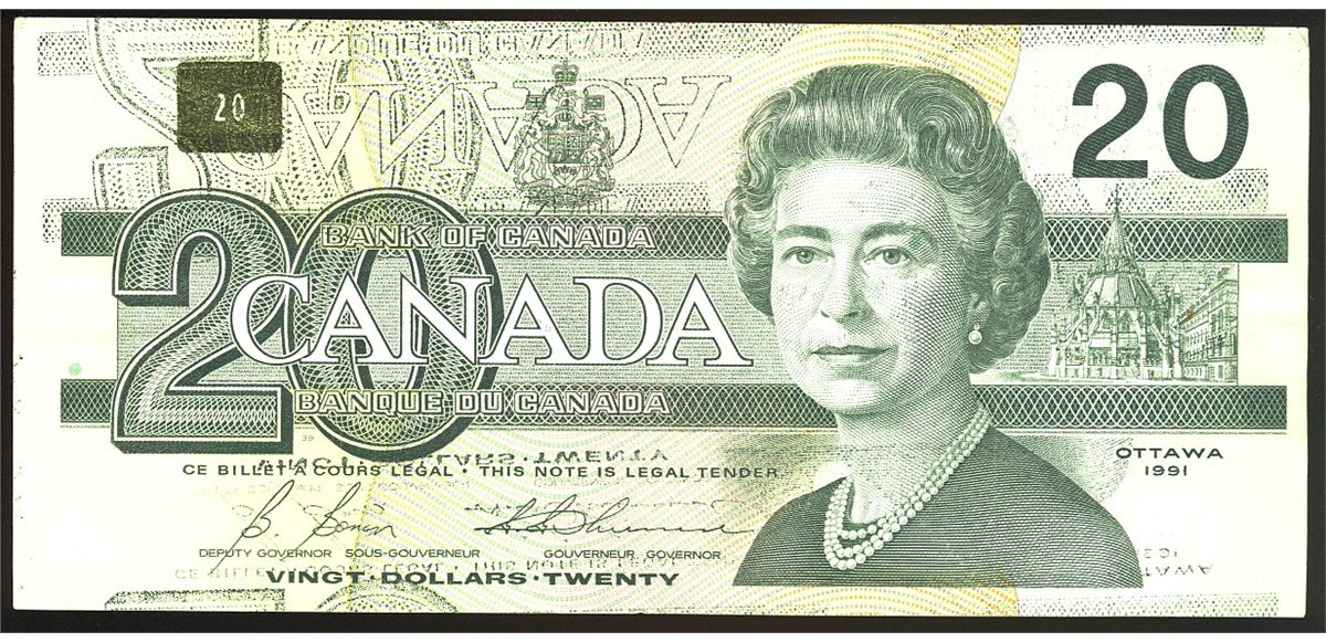 1991 $20 BC-58b #EVA5093458 ERROR issue. 60% overstamp on front of note. VF grade.