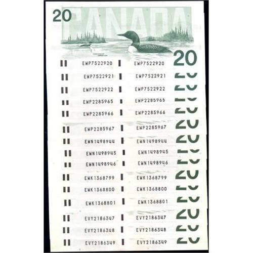 1991 Twenty Dollars Knight-Dodge, BC-58d, five sets of three sequential serial numbers each, EVY2186347-349, EWK1368799-801, EWN1498944-946, EWP2285965-967 and EWP7522920-922. Total fifteen notes, all Uncirculated