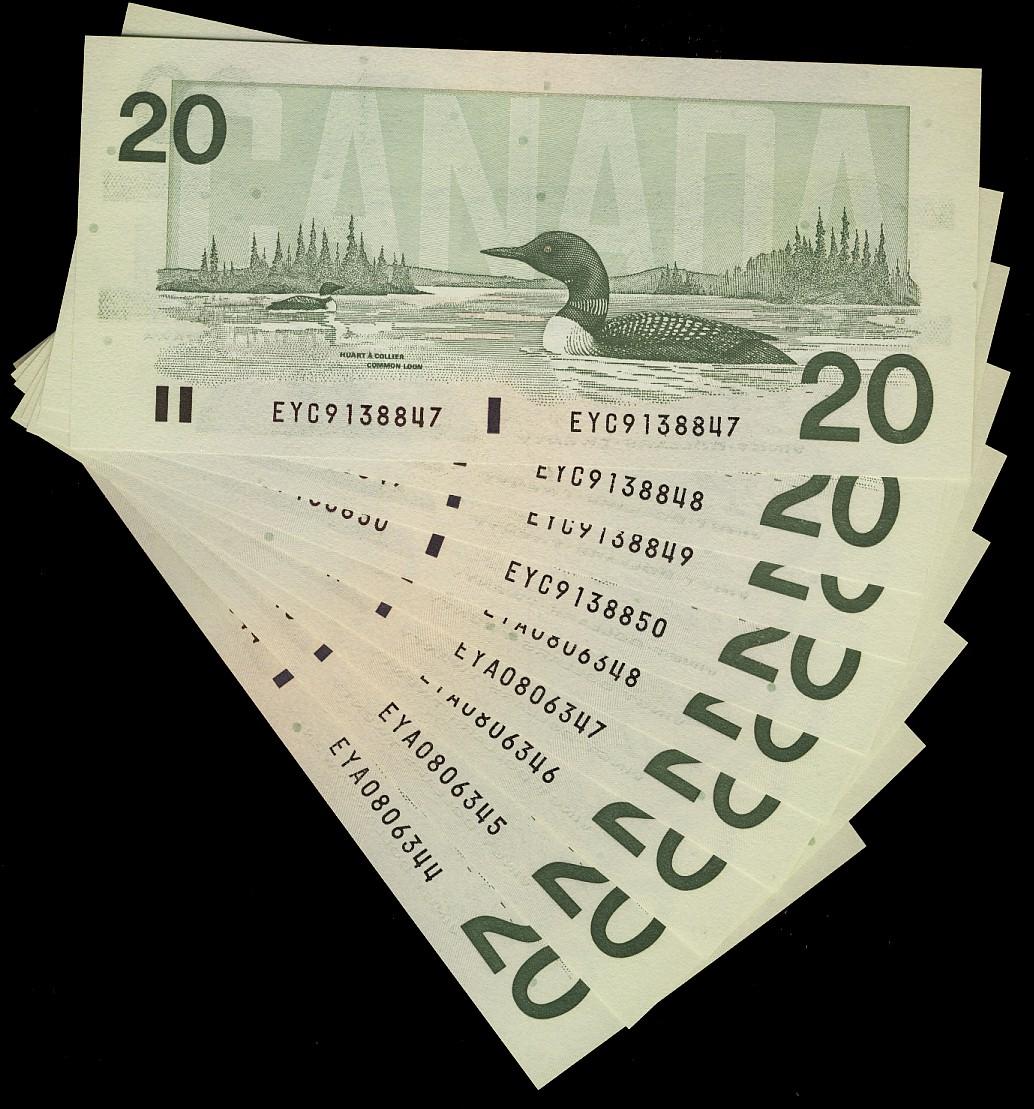1991 $20 BC-58d. Lot of nine notes. Includes two consecutive runs #EYA08063444-348 and #EYC9138847-850. Crisp Original UNC notes.