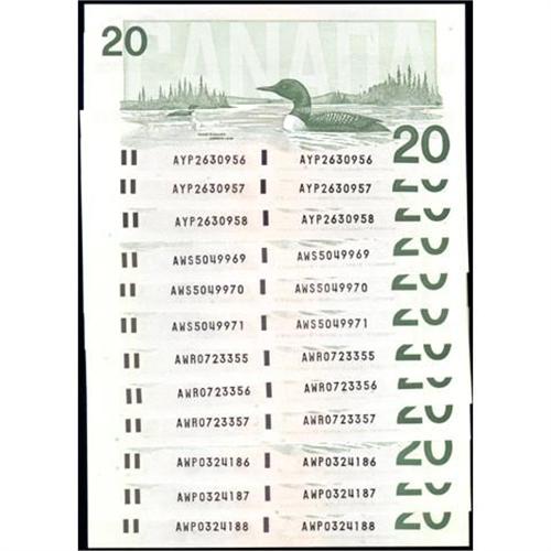 1991 Twenty Dollars Knight-Dodge, BC-58d-i, four sets of three sequential Serial Numbers: AWP0324186-188, AWR0723355-357, AWS5049969-971 and AYP2630956-958. Total twelve notes, all Uncirculated