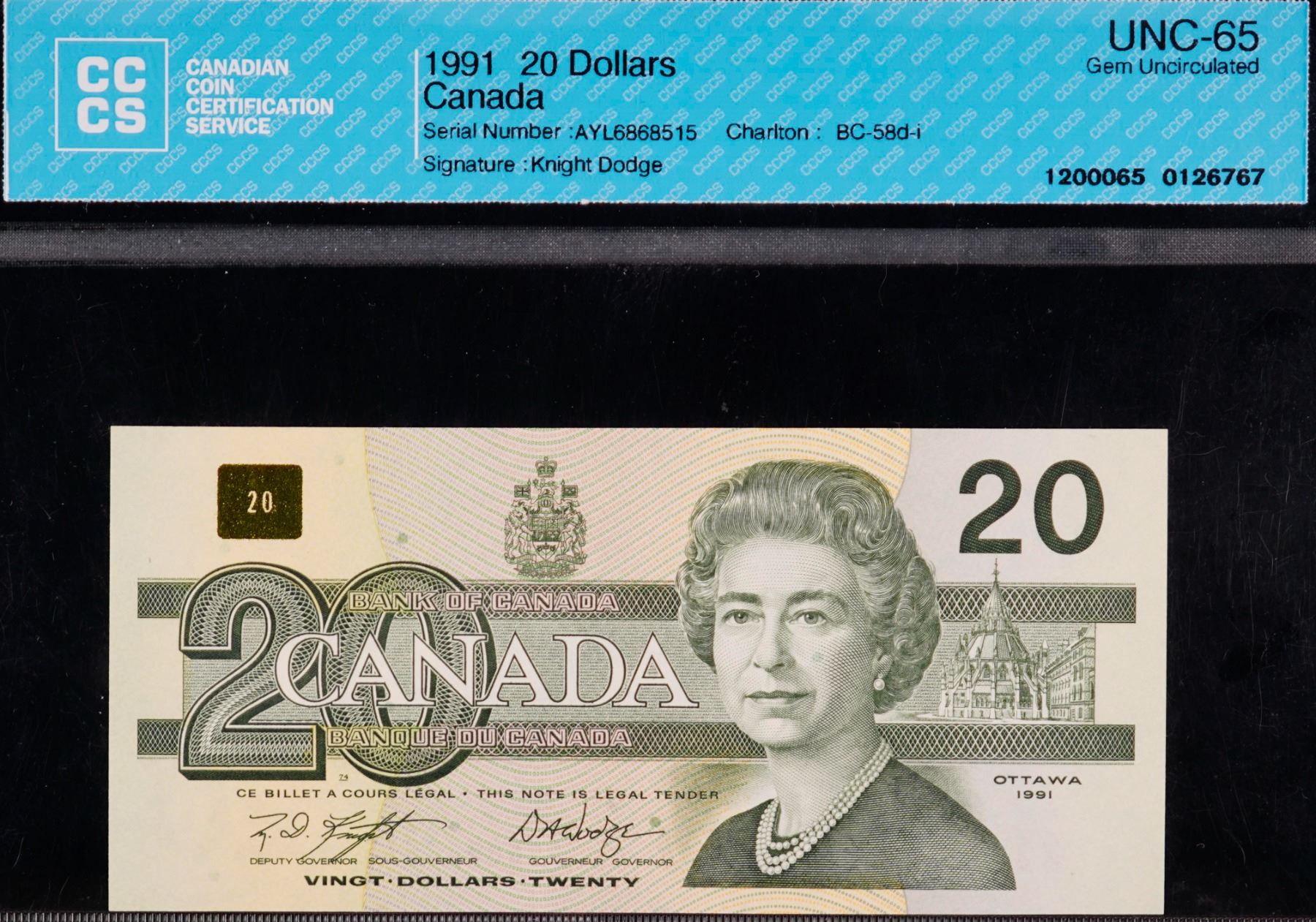 1991 $20 BC-58d-i #AYL6868515 CCCS Gem Uncirculated-65