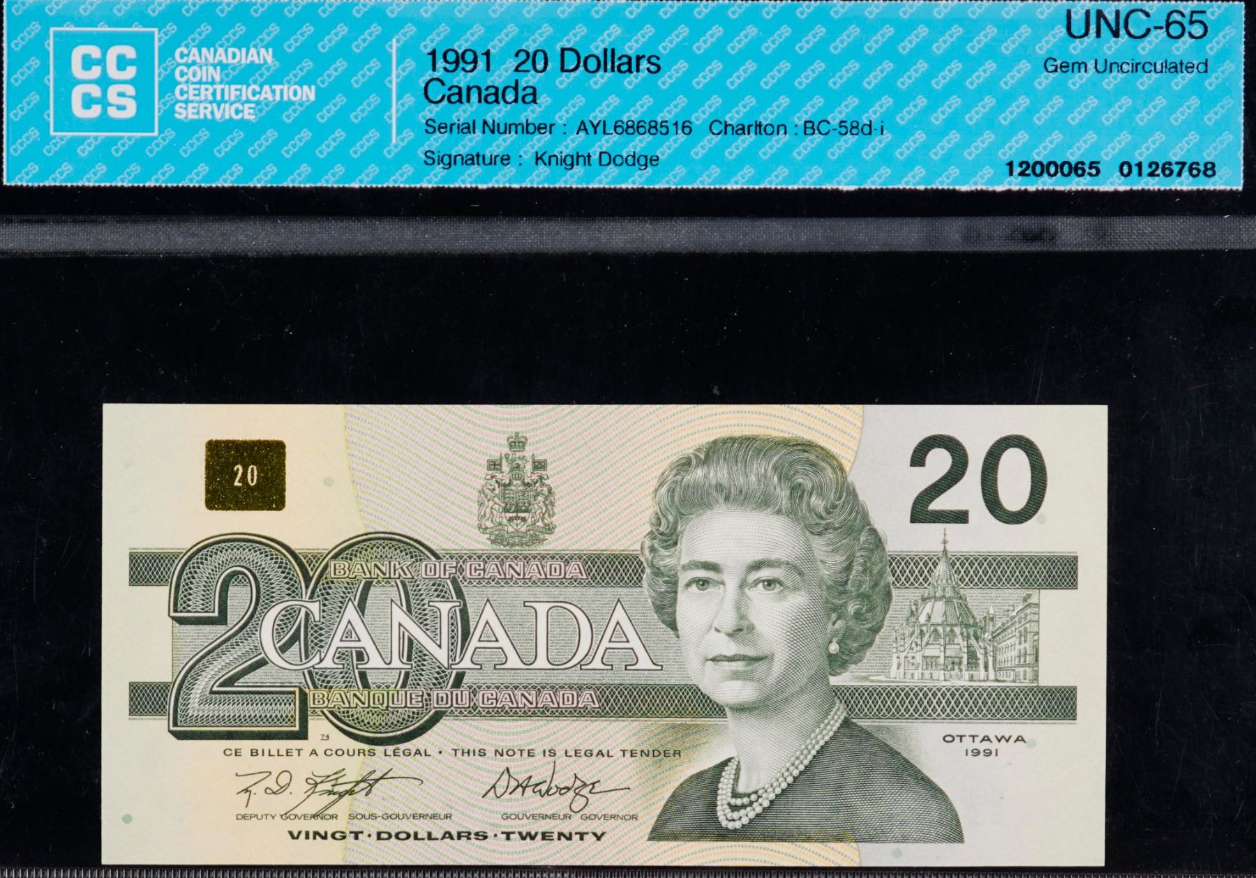 1991 $20 BC-58d-i #AYL6868516 CCCS Gem Uncirculated-65
