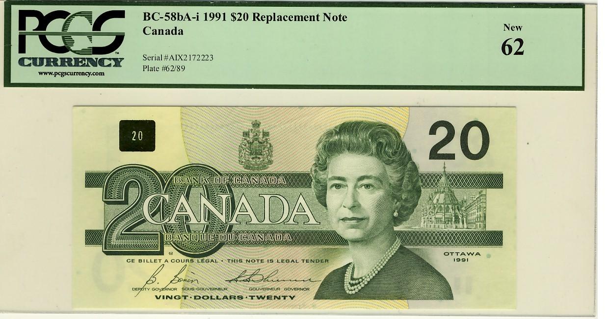1991 $20 repl w ser BC-58bA-i AIX 2172223 PCGS 62