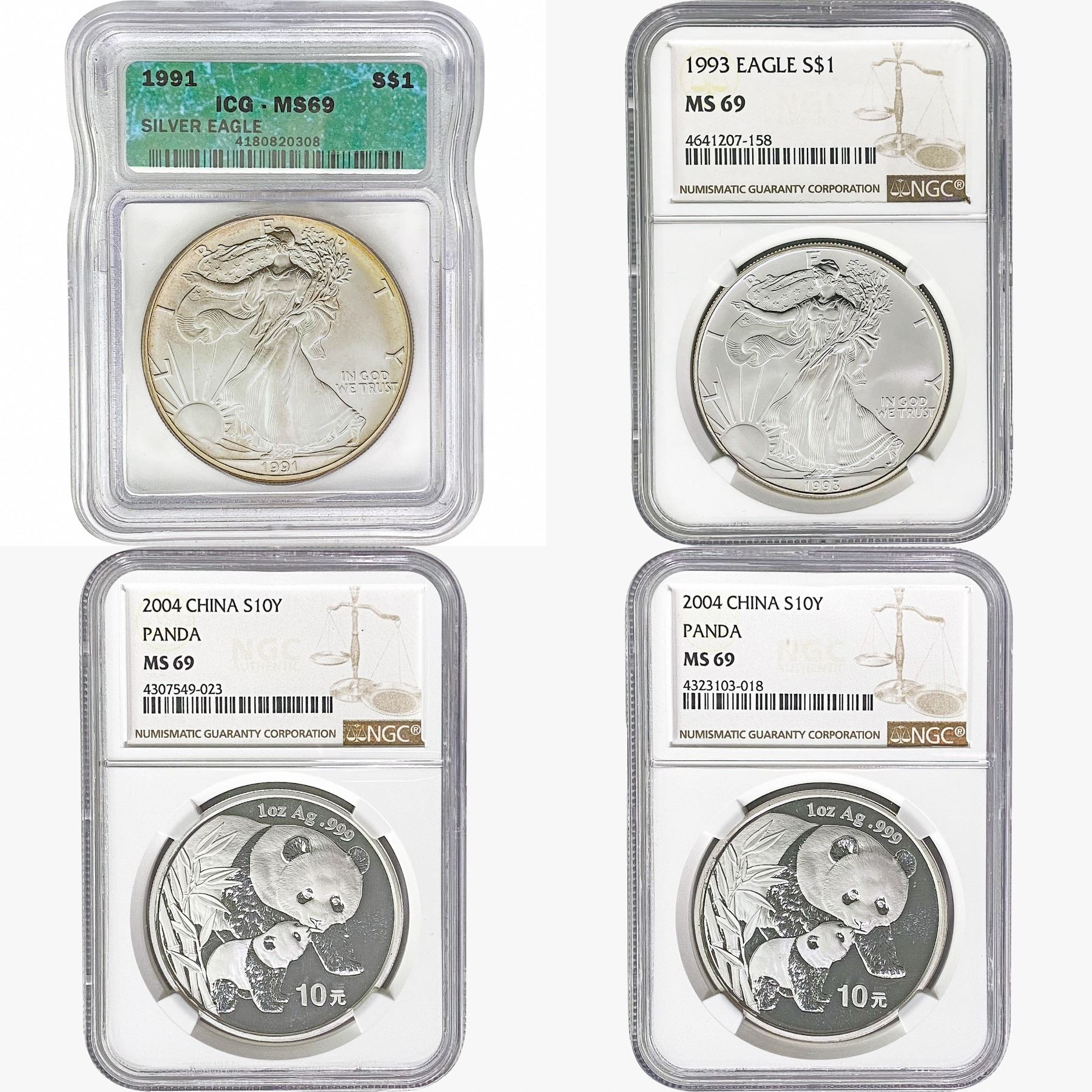 1991-2004 US Silver Eagle and Chinese Panda Lot [4 Coins] NGC/ICG MS69