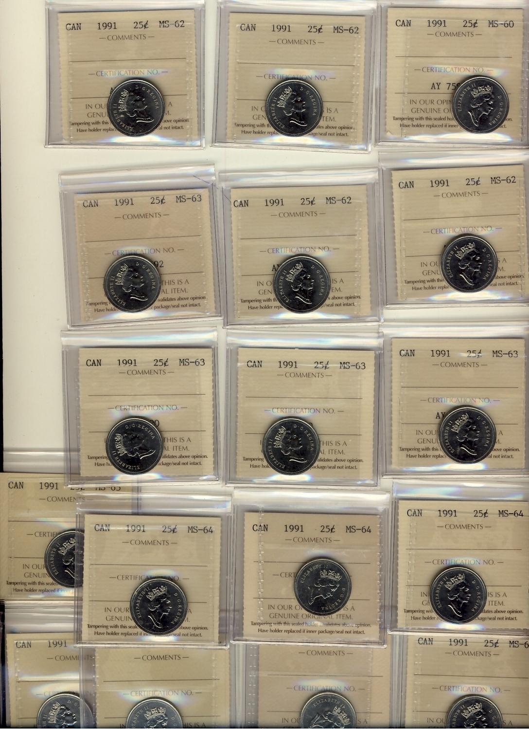 1991 25¢ MS60, MS62(4), MS63(4), MS64(6) & MS65(2). Lot of 17 coins all ICCS graded.