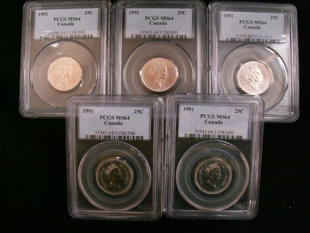 1991 25¢ PCGS MS64. Lot of 5 coins.