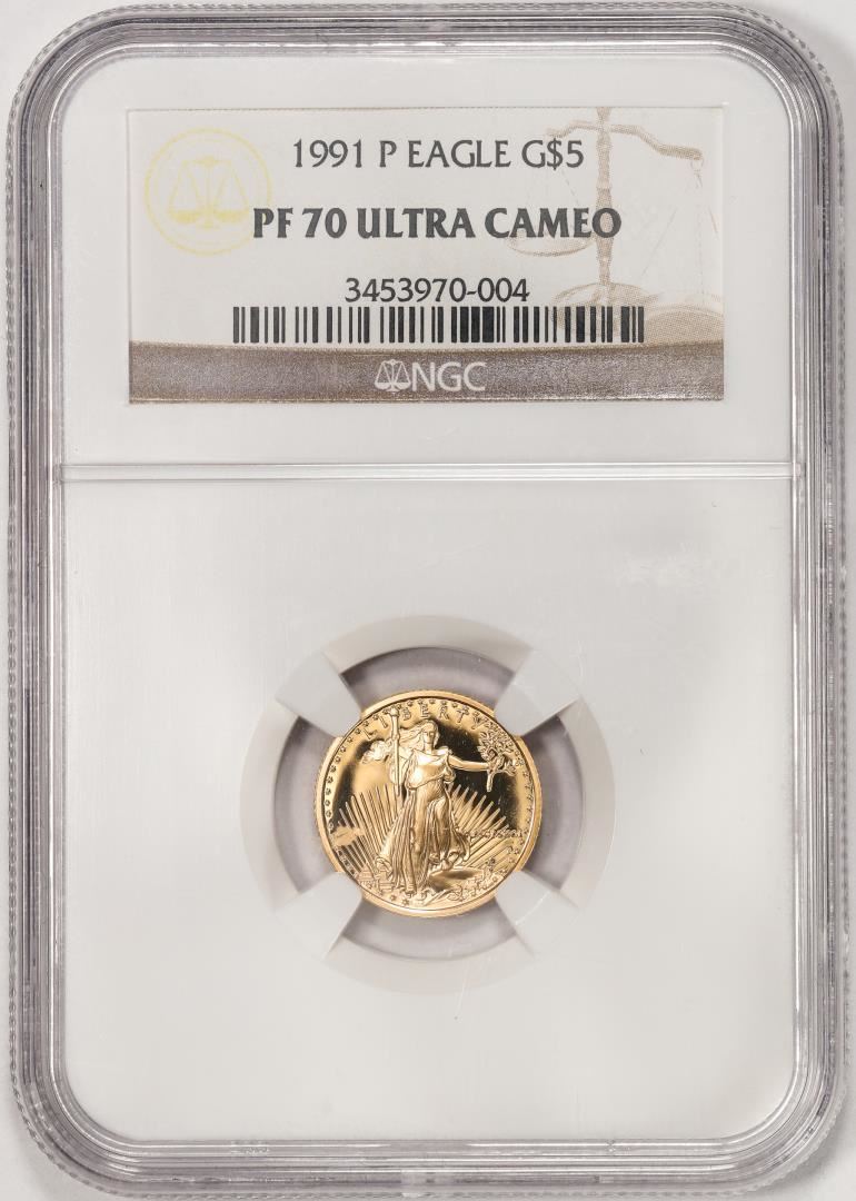 One 1991 $5 Proof American Gold Eagle Coin NGC PF70 Ultra Cameo. NGC Certified.
