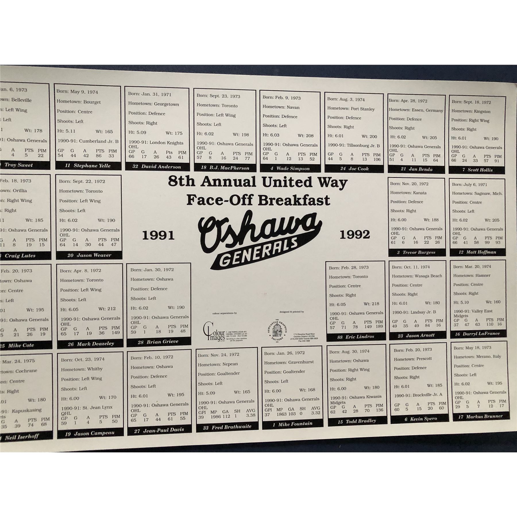 1991-92 Oshawa Generals (OHL) United Way team set, featuring Eric Lindros (HOF)