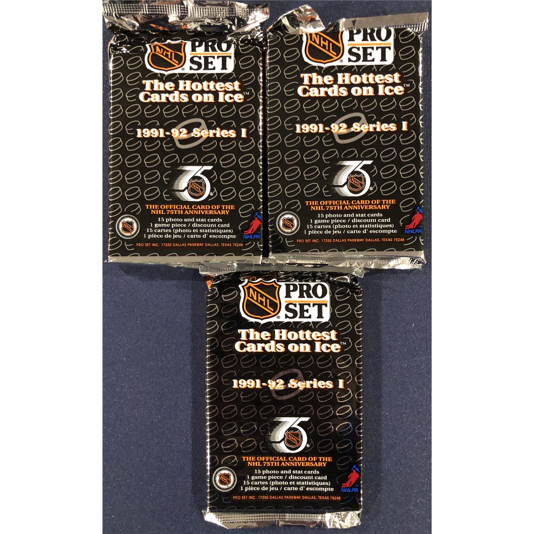 Three sealed foil packs, each containing 15 cards NHL, hockey