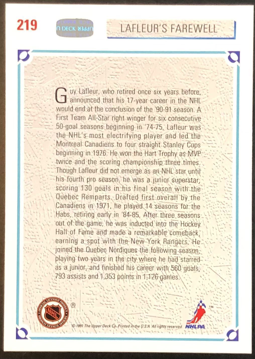 Card #219 hockey, NHL, UD, hall of fame