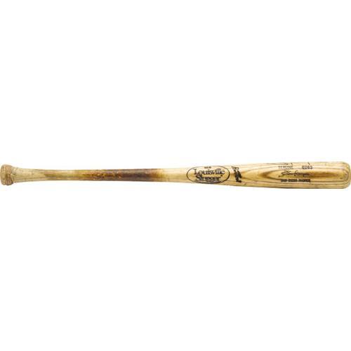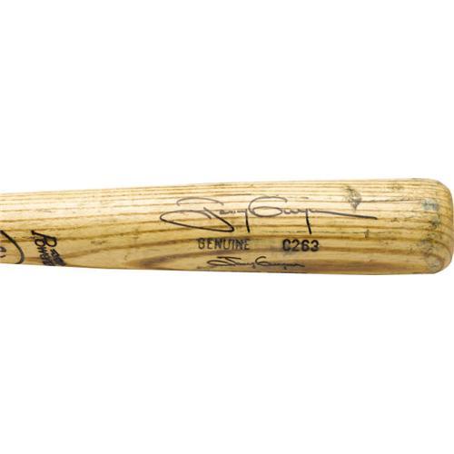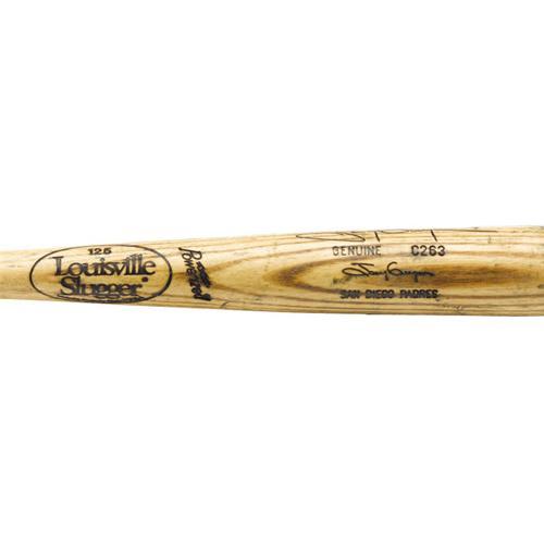 <B>1991-97 Tony Gwynn Game Used Bat.</B></I> Direct from the Gwynn family with their letter of provenance comes this heavily used signature model Louisville Slugger C263, the perfect keepsake from a man who resides between Jesse Burkett and Nap Lajoie on the career batting average charts. The barrel is simply coated with dark ball marks and various colors of bat rack striping, leading down to a crusty coating of pine tar at the handle. Gwynn's preferred tape job is still present at the knob, upon which the details of the bat's model, length, weight and owner's jersey number: "C263, 32 1/2 - 31, 19." The final touch is a 10/10 black sharpie signature from the newest Hall of Fame inductee on the knob. If you only buy one Gwynn game used bat, this is the one to have. <I>LOA from James Spence Authentication. LOA from PSA/DNA.</B></I><BR><BR><b>Shipping:</b> Bats, Clubs, Sticks, Swords, Rif (<a target="_blank" href="http://www.heritageauctions.com/common/shipping.php">view shipping information</a>)