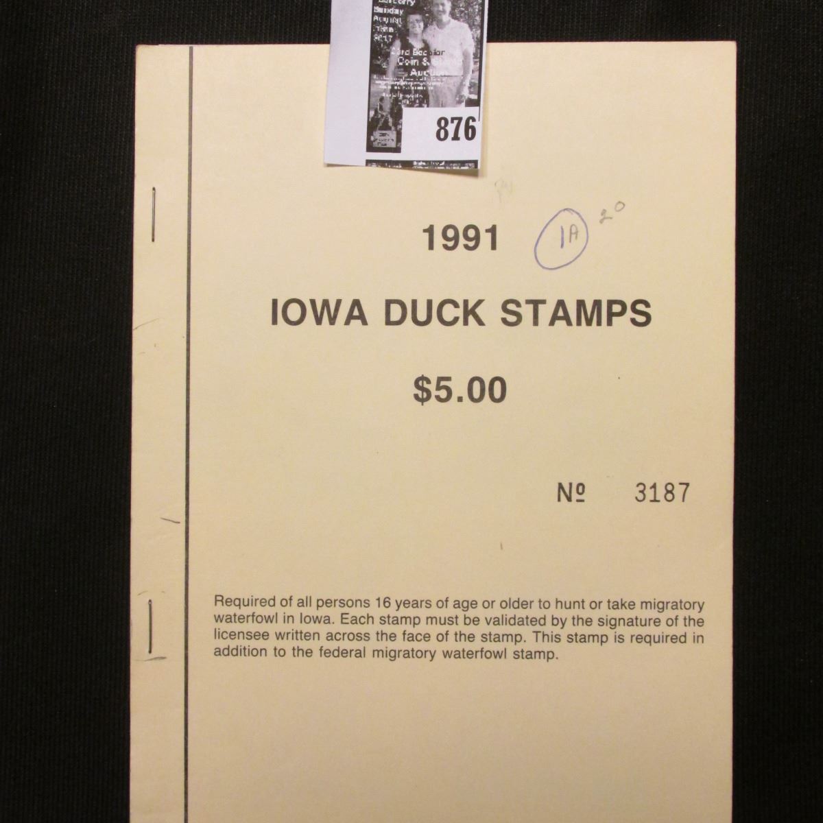 Anyone wishing to purchase lots through the mail bids in Iowa will also be charged sales tax, postage, and handling unless otherwise exempt. We will accept credit cards via the telephone. We also accept Pay Pal.