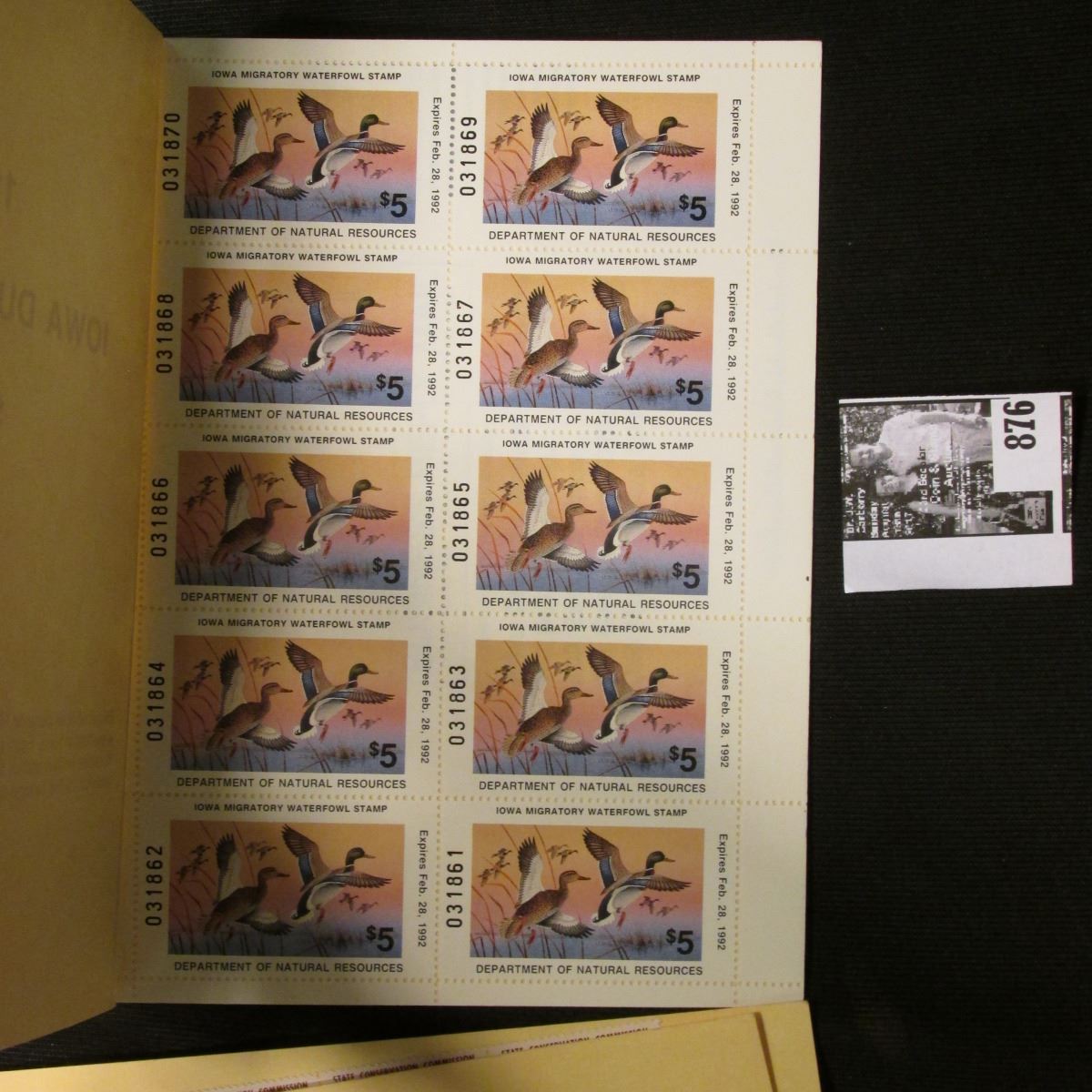 1991 Booklet Pane of Ten Iowa Duck Stamps in folder No. 3187. Crisp Uncirculated.