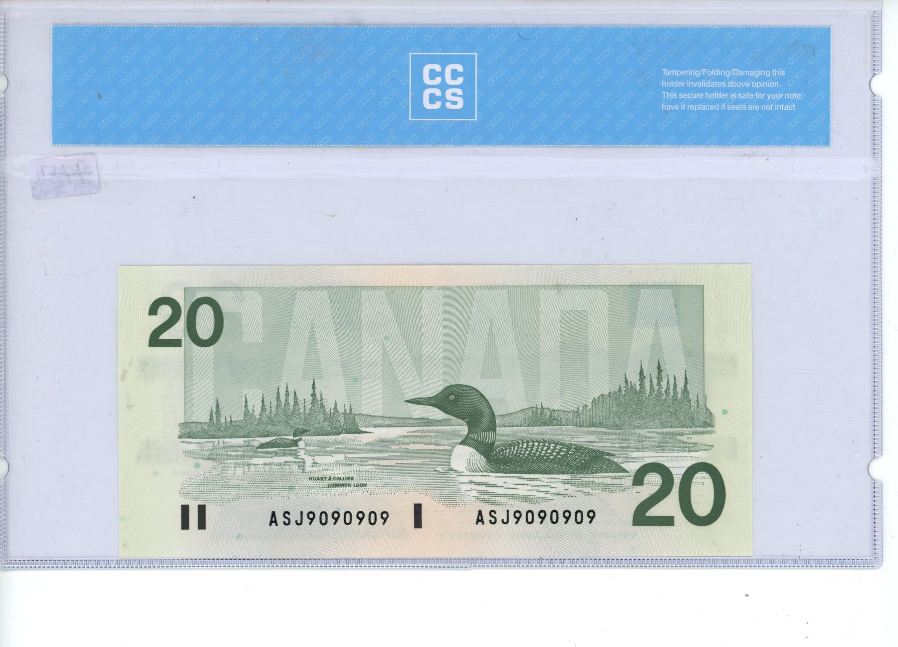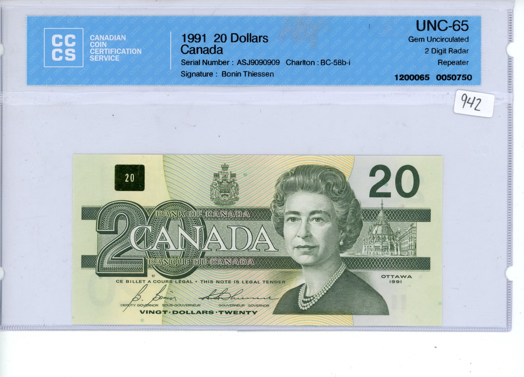 1991 Canadia $20 bill - CCCS Graded, 2digit Radar Seril #, Repeater, Gem UNC 65