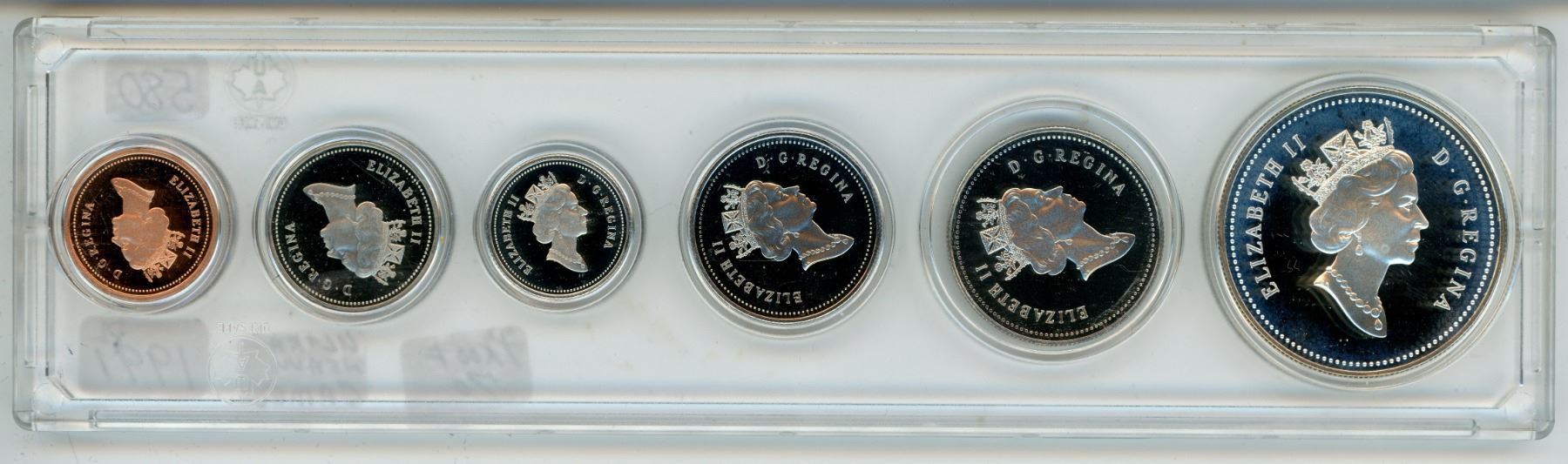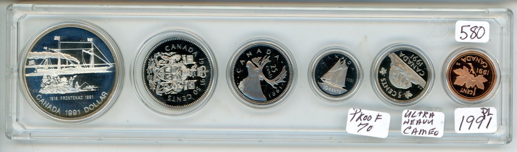 1991 Canadian 6 coin proof set, in plastic case - Includes, Frontenac silver dollar - UHC Proof