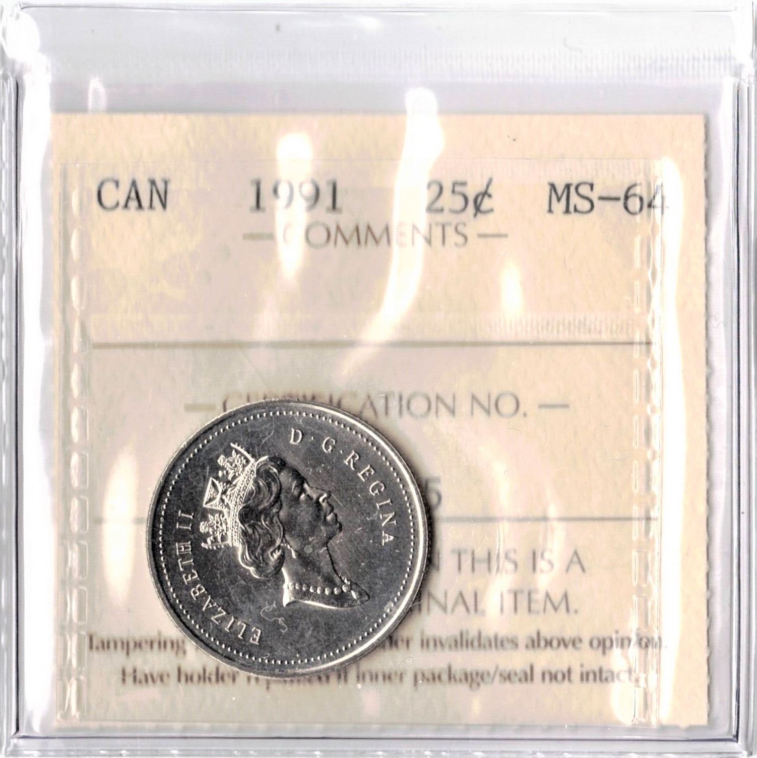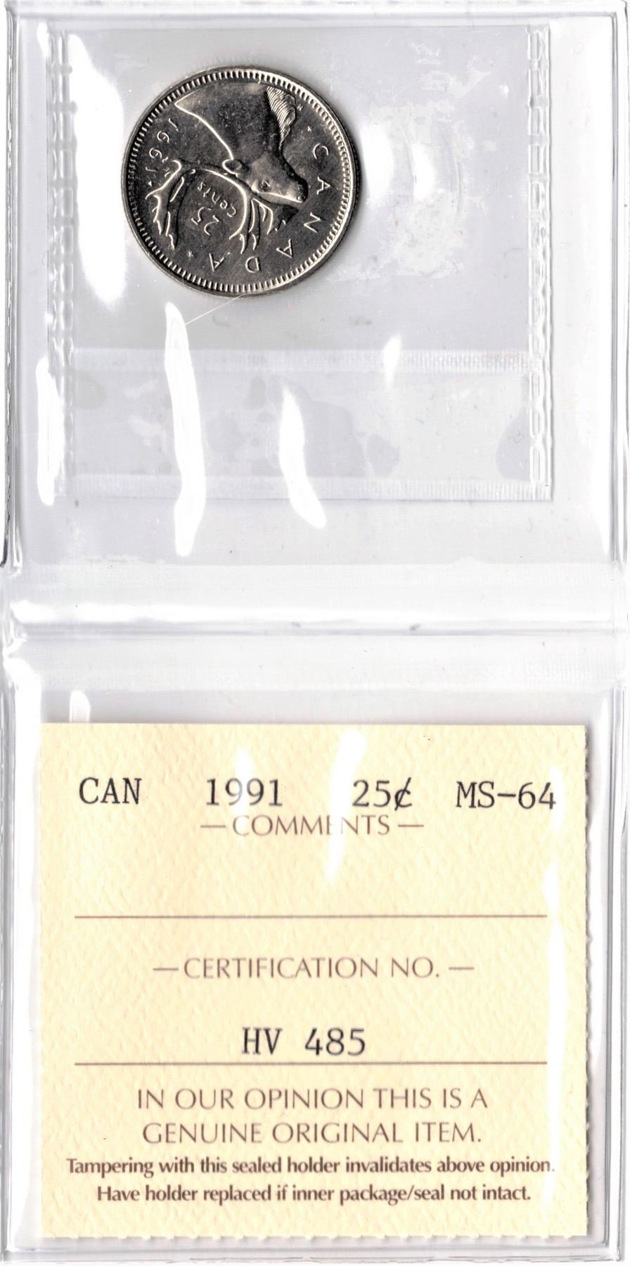 1991 Canadian Silver Twenty-Five Cent ICCS Graded MS-64