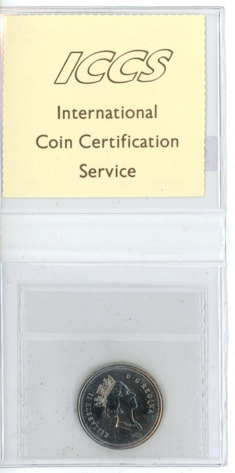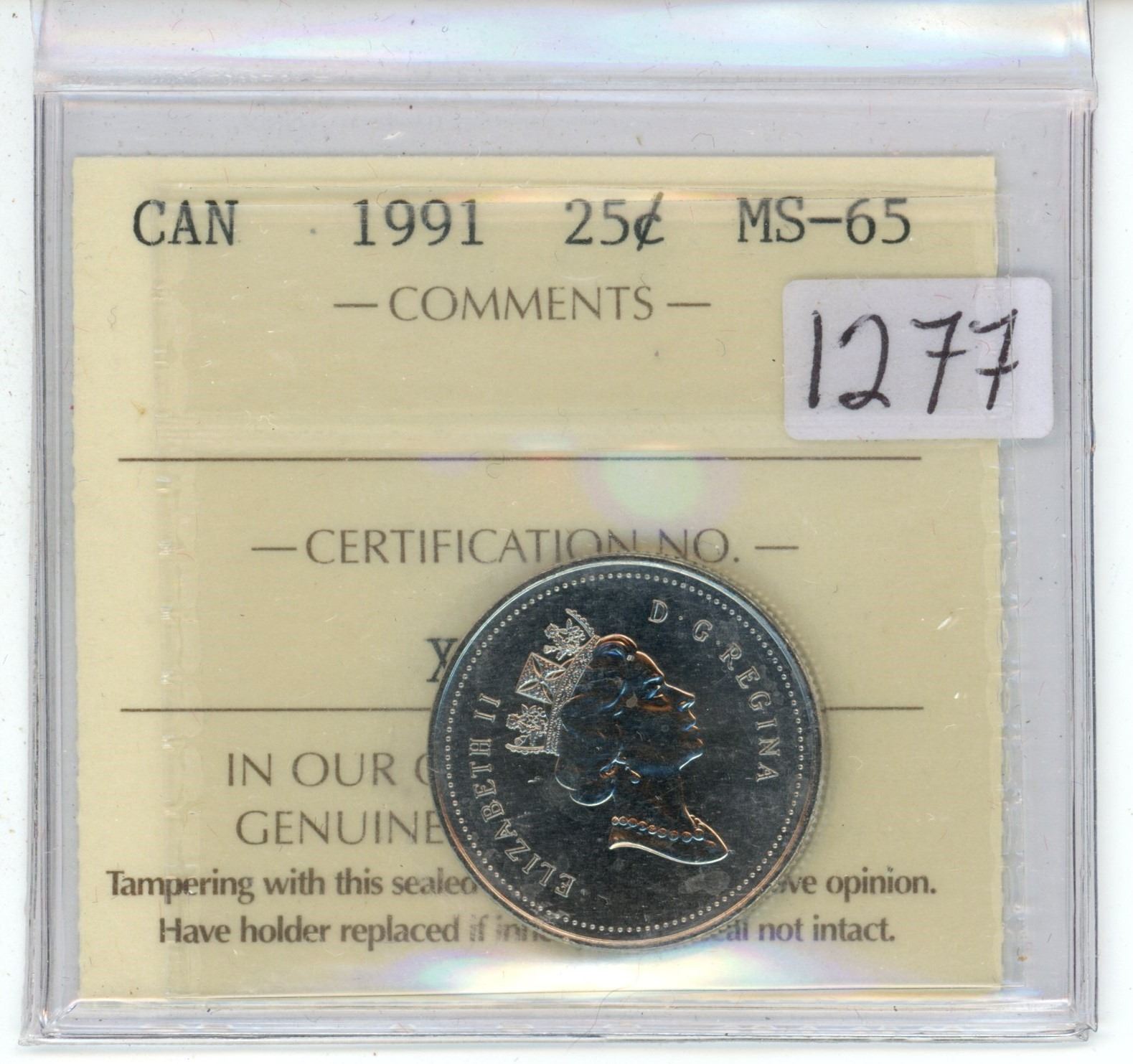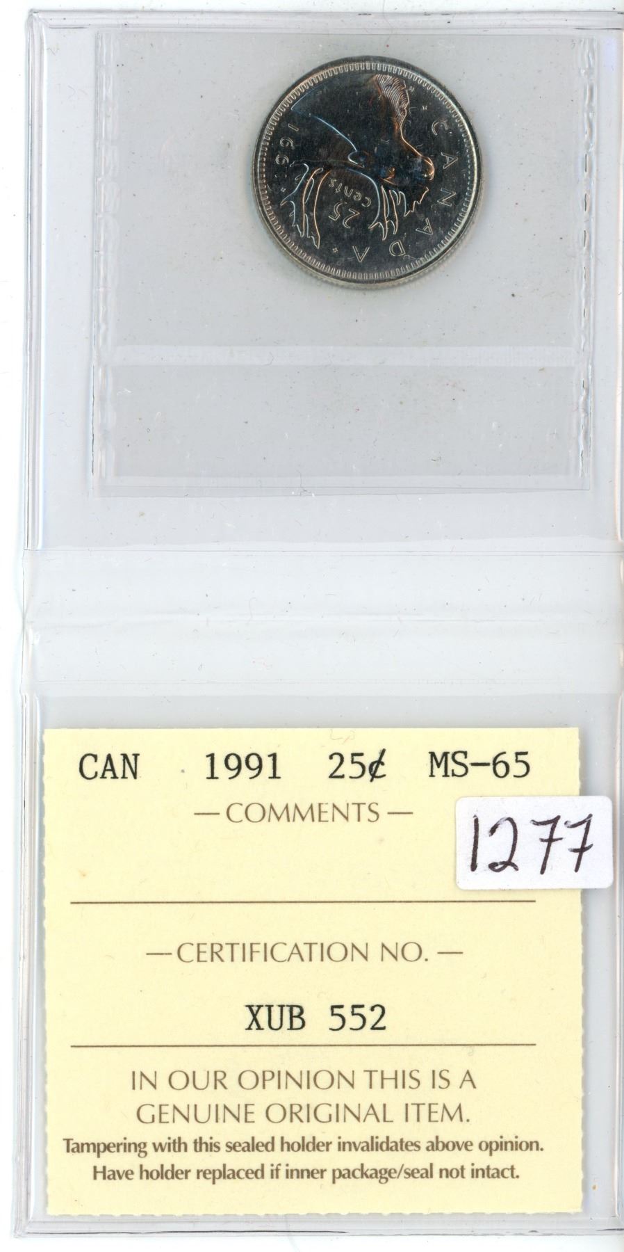 1991 Canadian graded, 25 cent coin - ICCS - MS65
