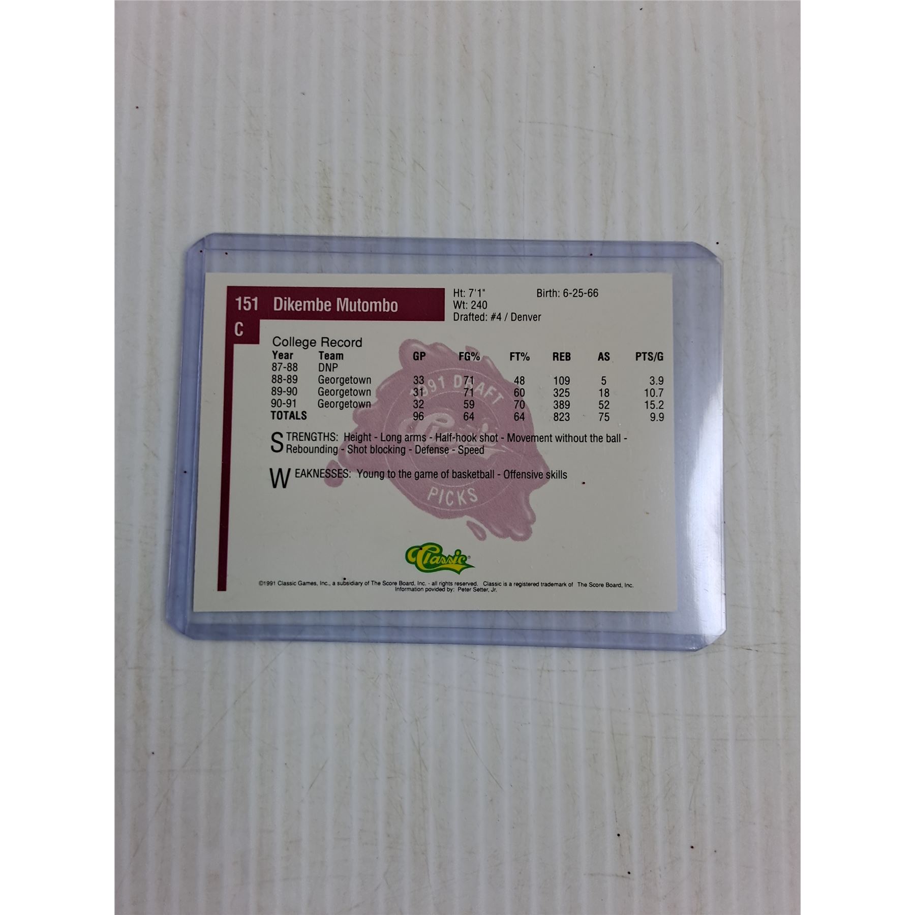 1991 Classic NBA Dikembe Mutombo  Draft Picks  Card - Cannot Guarantee Authenticity