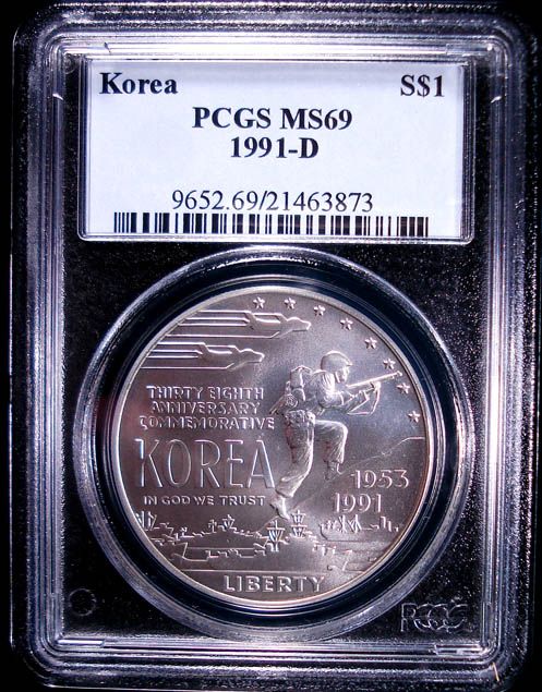 1991-D KOREAN WAR MEMORIAL COMMEMORATIVE SILVER DOLLAR, PCGS MS69!