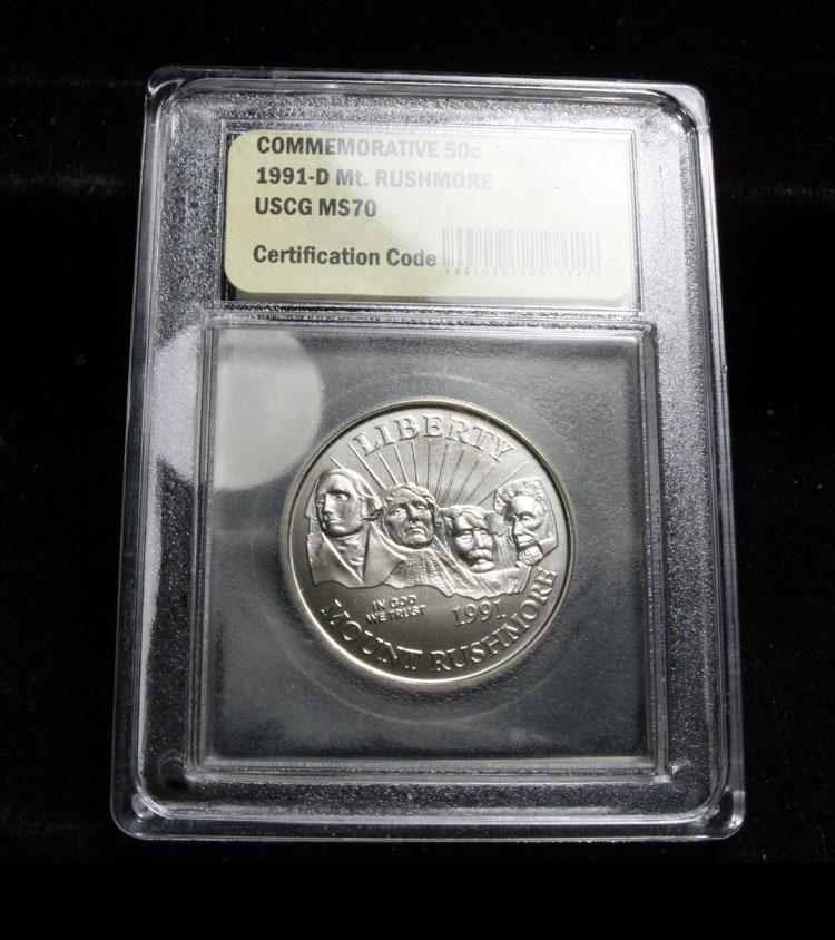 Issued to celebrate the Golden Anniversary of The completion of Mount Rushmore. PCGS lists an ms70 at $3300 WOW!!. This coin is Graded perfect ms70 by USCG. Estimated Value $300.