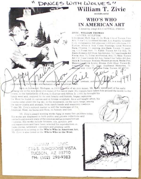 1991 ''Dances with Wolves'' Framed Print by William T. Zivic, framed, double matted, and under glass, hand signed