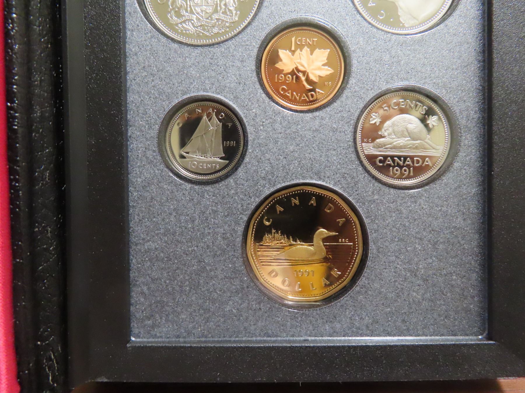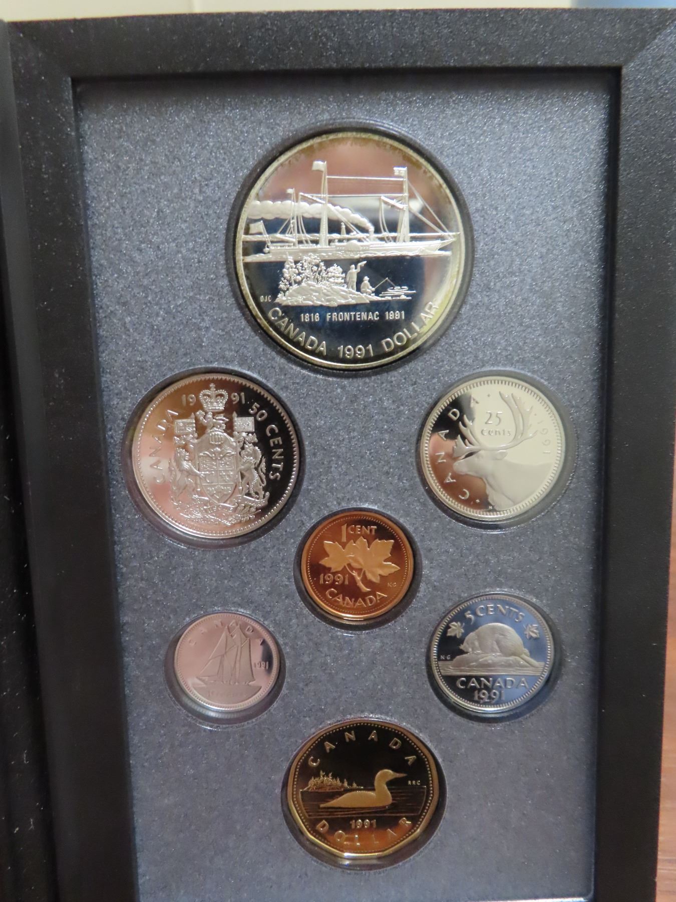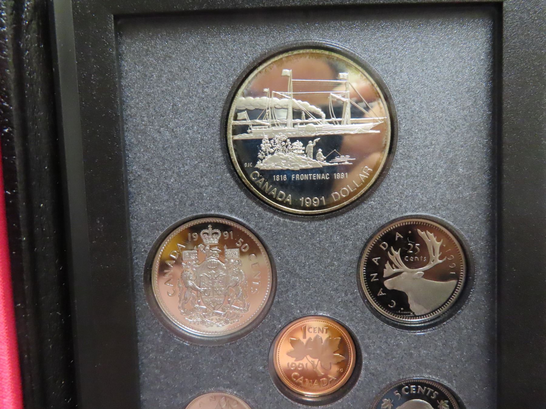 1991 Double Dollar Proof Set. Silver Dollar commemorates the famous ship Frontenac. Proof with Ultra Heavy Cameos. Housed in its original Royal Canadian Mint case of issue. Includes Certificate of Authenticity.
