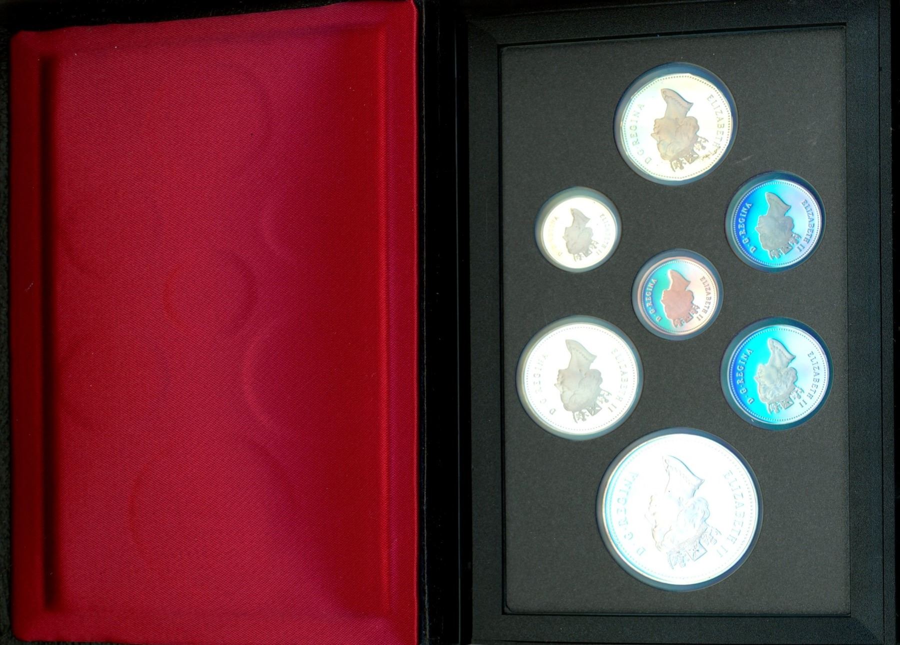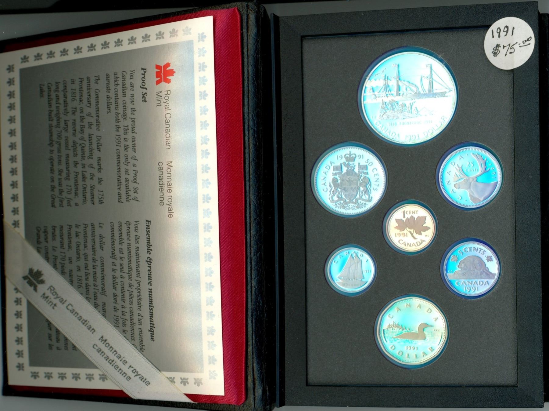 1991 Double Dollar Proof set. 7-coin set includes Frontenac Silver Dollar as well as the Rare 1991 25 cents. Housed in its original case.