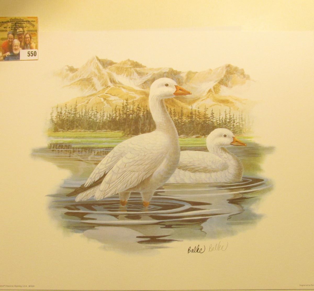 1991 Fleetwood hand autographed print of a pair of Ross' Geese at Rest by Don Balke, 10.5" x 13.25".