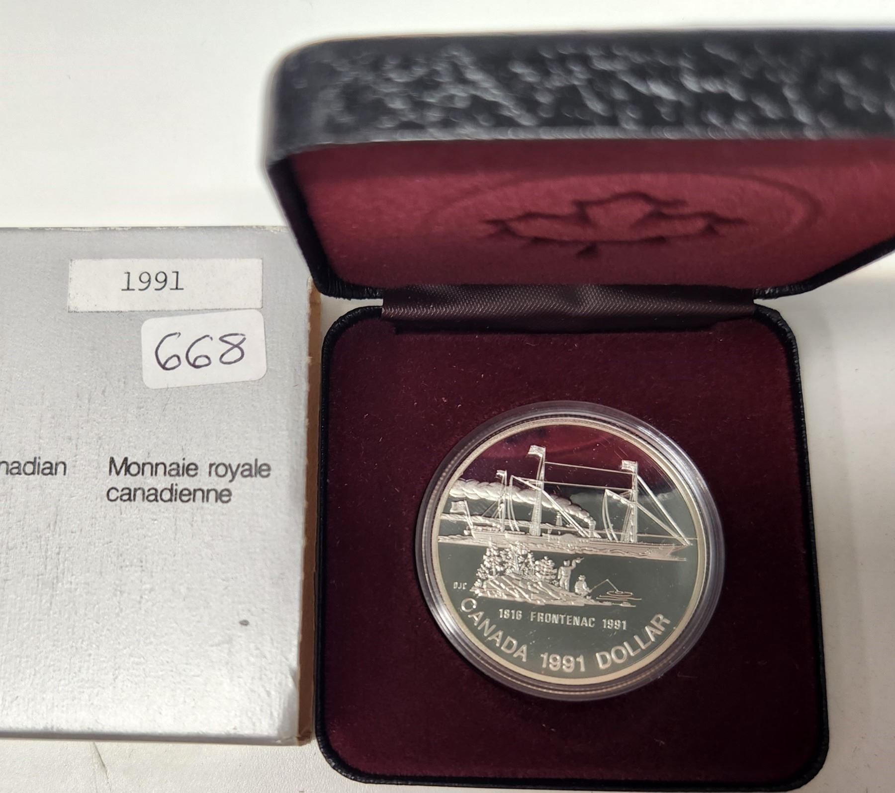 1991 Frontenac Proof Silver Dollar. Commemorates the 175th Anniversary of the first steam shjp to sail the Great Lakes. Bright White with Ultra Heavy Cameo. In case and box of issue.