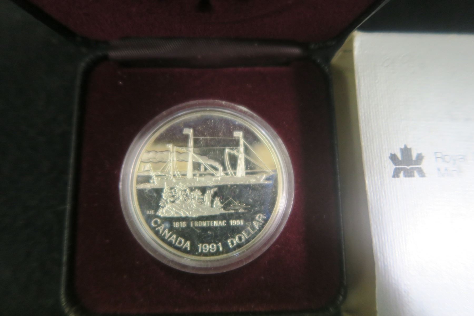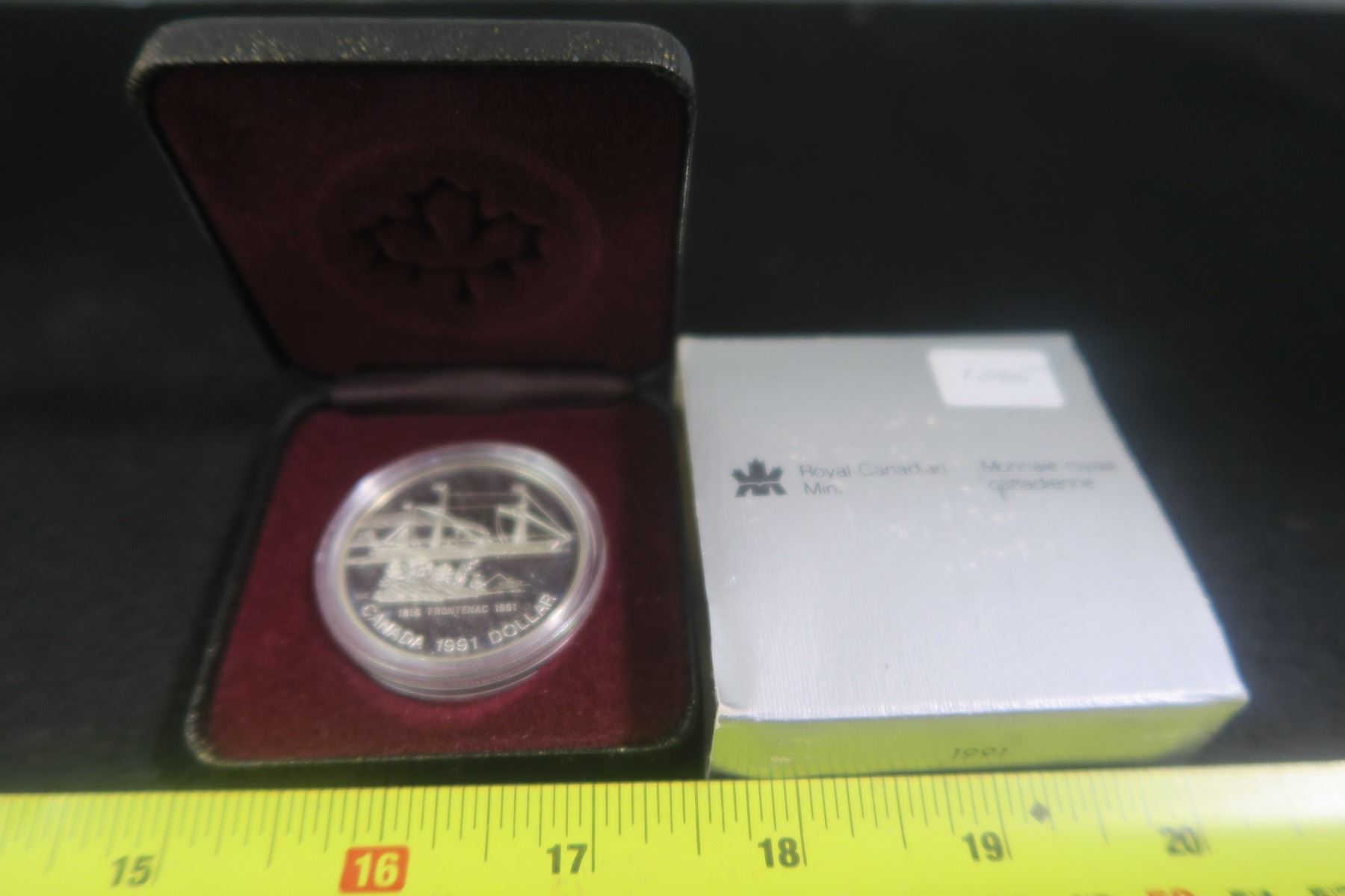 1991 Frontenac Silver Dollar. Commemorates the 175th Anniversary of the first steamship on the Great Lakes. Proof. Housed in its original case of issue.