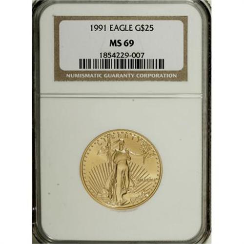 <B>1991 G$25 Half-Ounce Gold Eagle MS69 NGC.</B></I> NGC Census: (1004/5). PCGS Population (620/5). Mintage: 24,100. Numismedia Wsl. Price for NGC/PCGS coin in MS69: $1,250. (#9852)<BR><BR><b>Shipping:</b> Coins & Currency (<a target="_blank" href="http://www.heritageauctions.com/common/shipping.php">view shipping information</a>)
