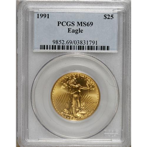 <B>1991 G$25 Half-Ounce Gold Eagle MS69 PCGS.</B></I> Bright orange-gold color. Nearly flawless surfaces.<BR><BR><b>Shipping:</b> Coins & Currency (<a target="_blank" href="http://www.heritageauctions.com/common/shipping.php">view shipping information</a>)