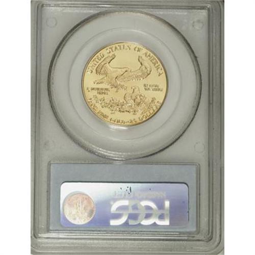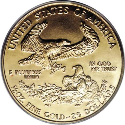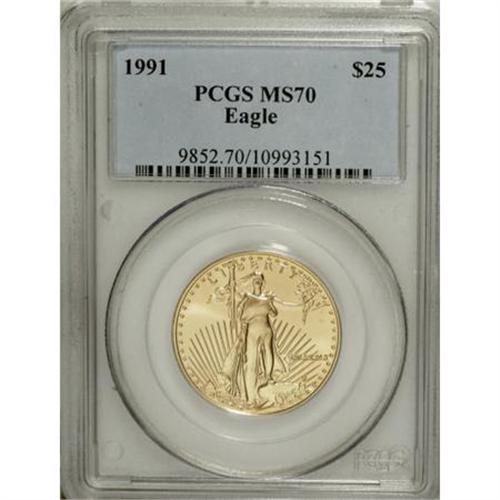 <B>1991 G$25 Half-Ounce Gold Eagle MS70 PCGS.</B></I> With a mintage of just 24,100 pieces, the uncirculated-finish 1991 half-ounce gold American Eagles have achieved somewhat of a key-date status. This boldly struck example displays gorgeous peach-gold surfaces that have been immaculately preserved. An unimprovable piece. Population: 6 in 70 (11/07).<BR><BR><b>Shipping:</b> Coins & Currency (<a target="_blank" href="http://www.heritageauctions.com/common/shipping.php">view shipping information</a>)